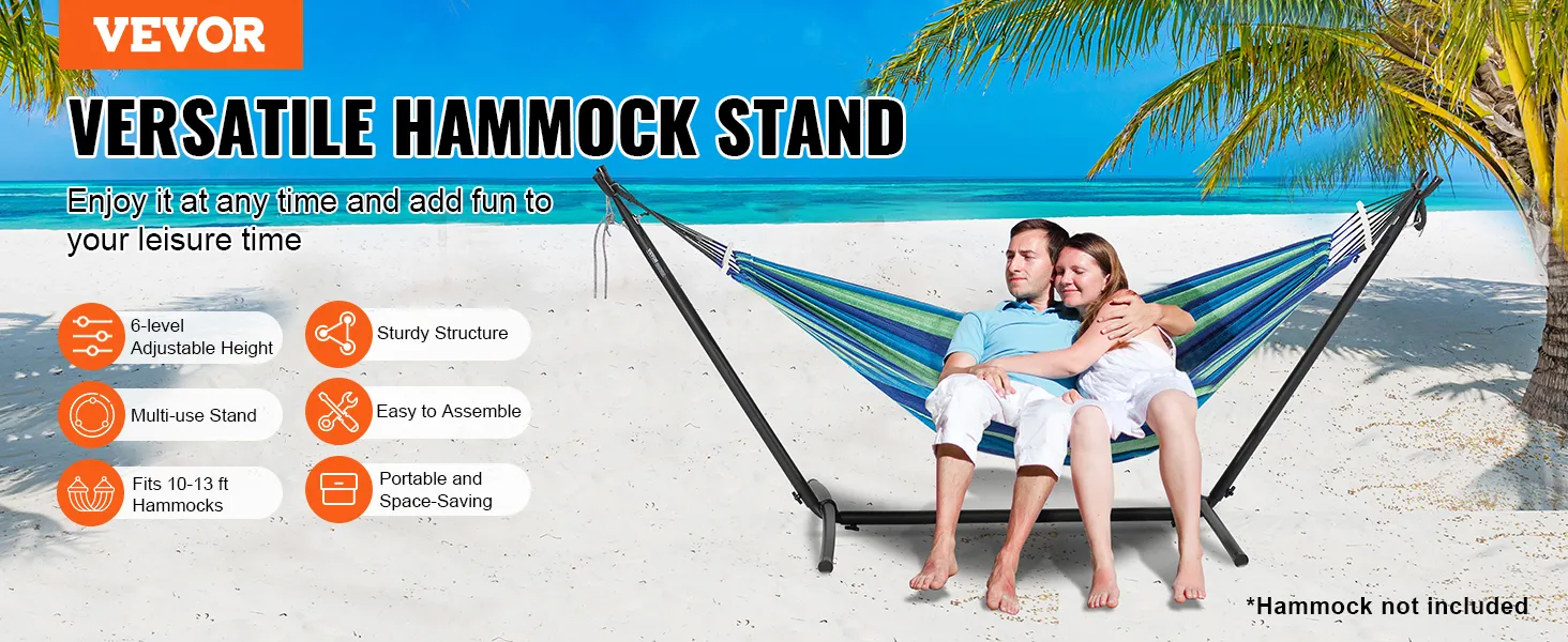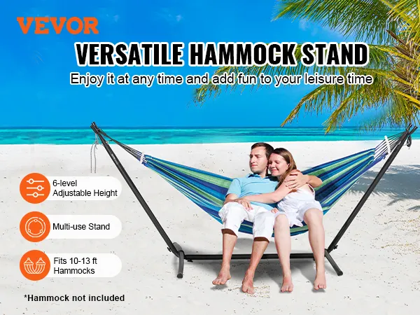 Our hammock stand for outside supports single and double hammocks, suitable for hammock lengths from 10 to 13.1 feet (3.05m to 4m), perfect for personal relaxation or chilling with close ones. It accommodates various hammock types including Brazilian, Curved, and Spreader Bar hammocks.