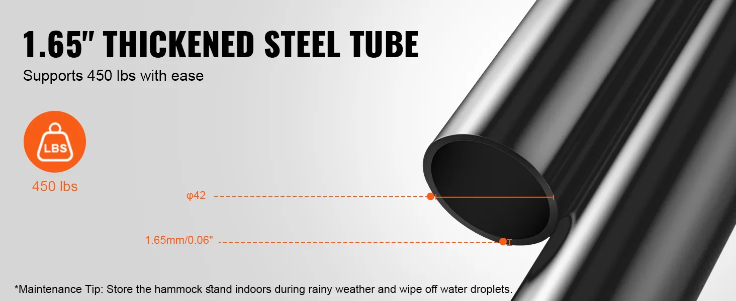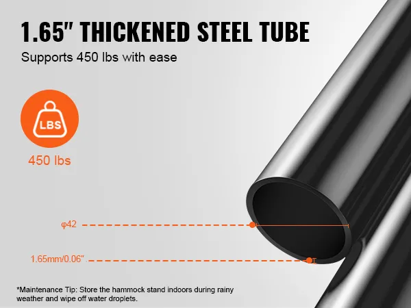 Constructed with φ1.65 inch (φ42mm) thickened steel tubes, this portable hammock stand supports up to 450 pounds, ensuring your safety and comfort. The thickened steel tube structure ensures outstanding stability and durability, effortlessly accommodating multiple users.