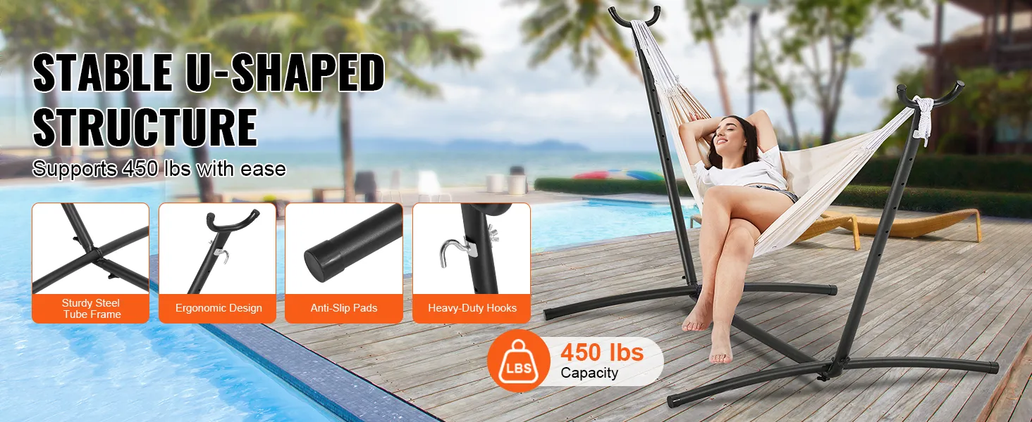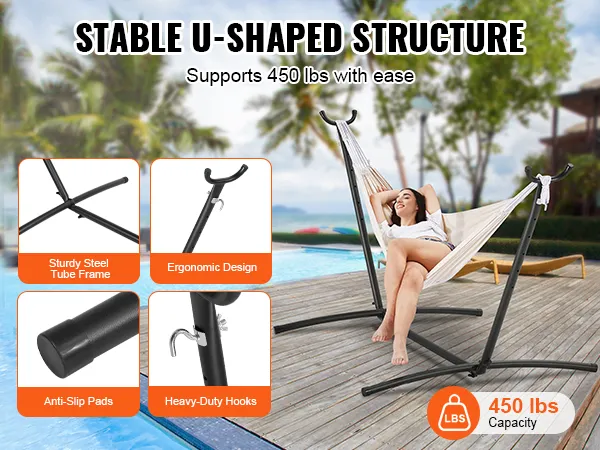 Sturdy Structure: We've reinforced each stress point and stabilized the structure repeatedly, polishing it to a fine surface. The steel hammock stand can support up to 450 lbs, ensuring you and your children can enjoy your hammock time safely. Non-slip pads enhance stability and safety, particularly when children are climbing in and out.