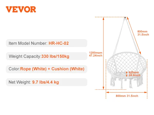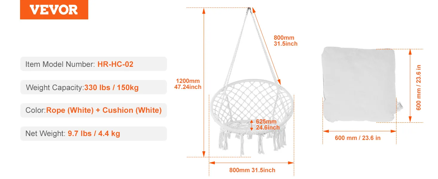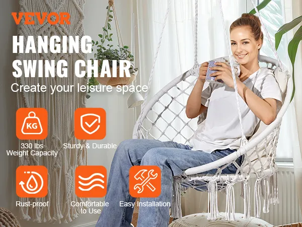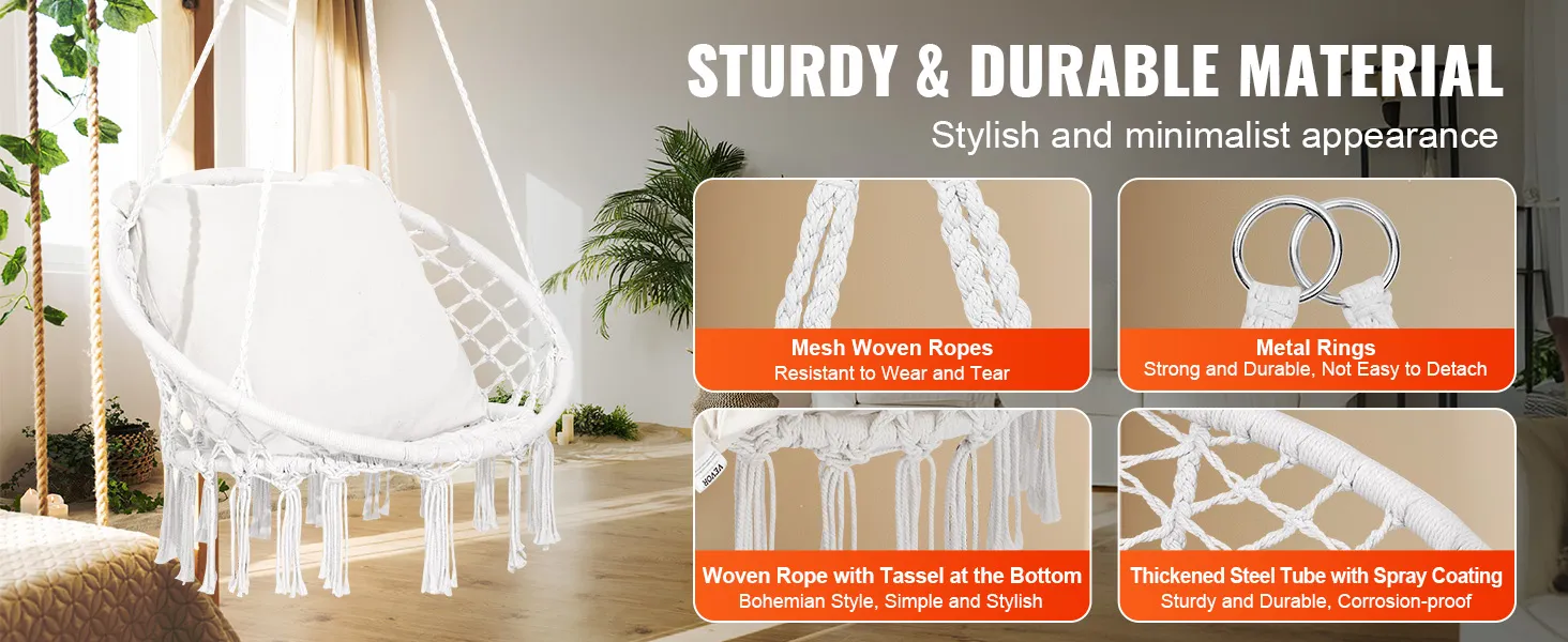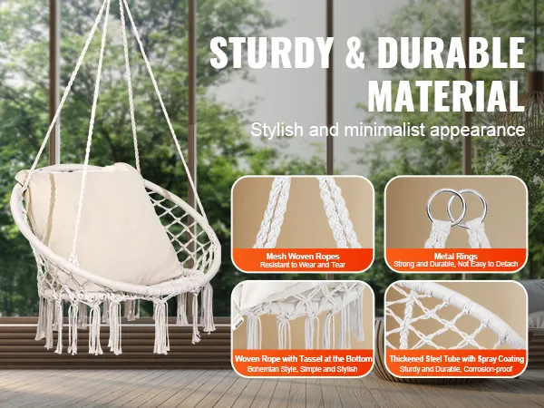 Stevig materiaal: onze hangstoel is voorzien van een versterkt stalen frame gecombineerd met geweven gaastouwen voor een veilige bevestiging. Dit stevige ontwerp zorgt voor stabiliteit met een draagvermogen tot 150 kg, waardoor het geschikt is voor de meeste volwassenen.