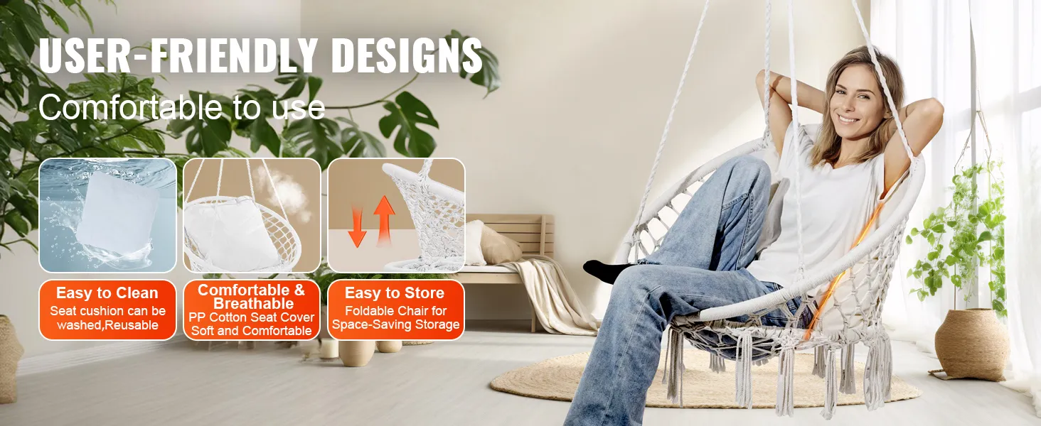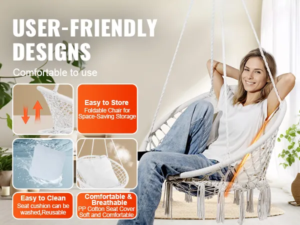 Comfortabel zitten: Uitgerust met een zitkussen gevuld met PP-katoen, zorgt deze hangstoel voor een zacht, ademend gevoel dat je rug en heupen beschermt. Het kussen is wasbaar. Na gebruik kan de stoel worden ingeklapt voor een compacte opslag. Het bespaart ruimte en is comfortabel!