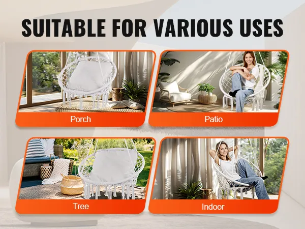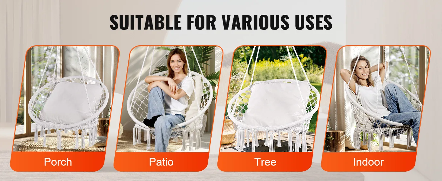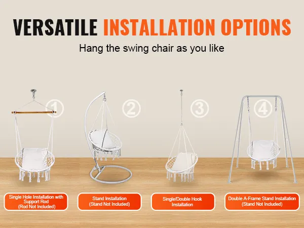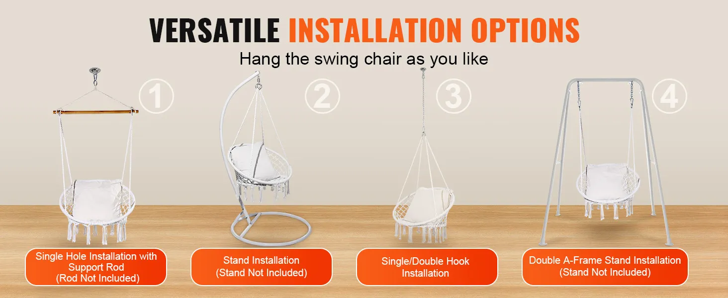 Eenvoudige installatie: gebruik de meegeleverde accessoires om de binnenschommel eenvoudig zelf aan uw plafond, boom, hangmatstandaard of stevige balk te installeren. Houd er rekening mee dat bij verschillende ophangmethoden mogelijk extra accessoires nodig zijn die niet zijn meegeleverd.