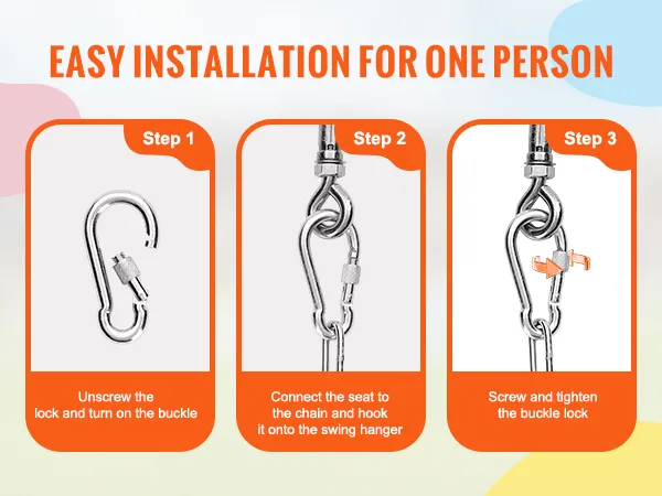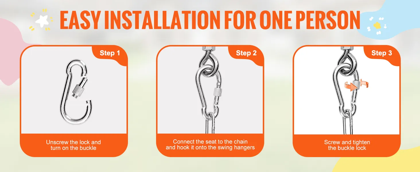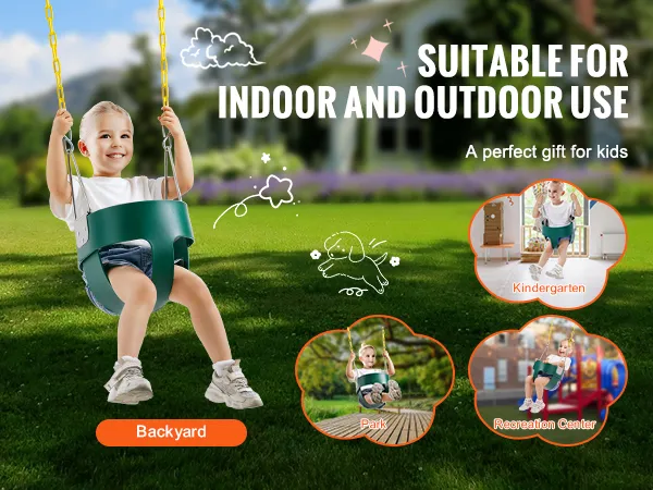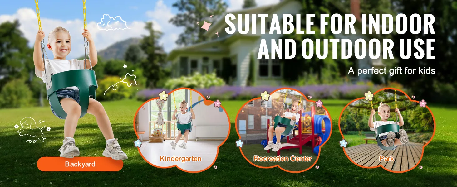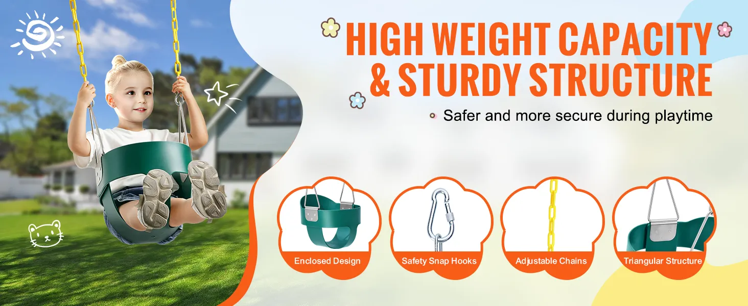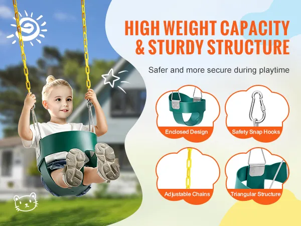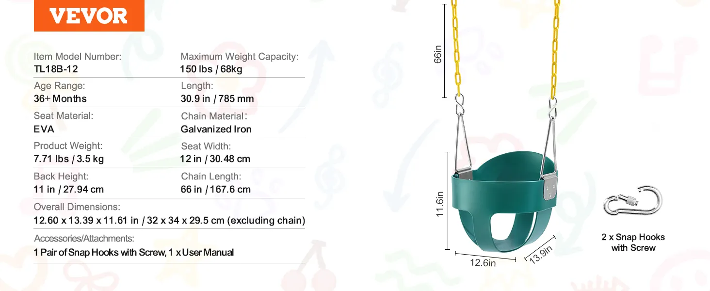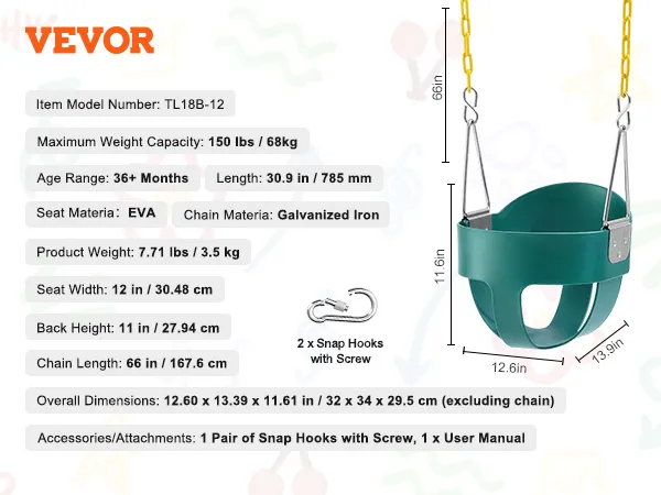68 kg hoog draagvermogen: de robuuste VEVOR-peuterschommel met hoge rugleuning en volle kuipstoel ondersteunt een maximaal gewicht van 68 kg en is geschikt voor oudere kinderen voor langdurig gebruik. De schommel is voorzien van stevige kettingen, een volle kuipstoel en karabijnhaken voor veilig spelen.
