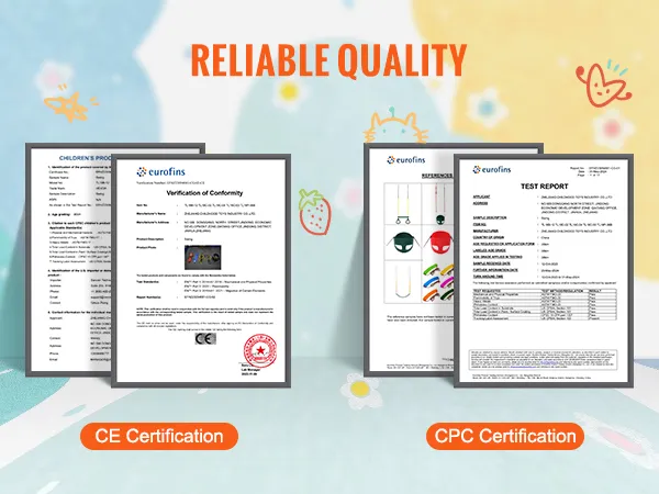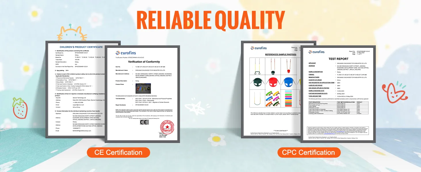 Deze babyschommel voor buiten is CE- en CPC-gecertificeerd, wat de hoogste kwaliteitsnormen garandeert en u veiligheid en betrouwbaarheid garandeert.
