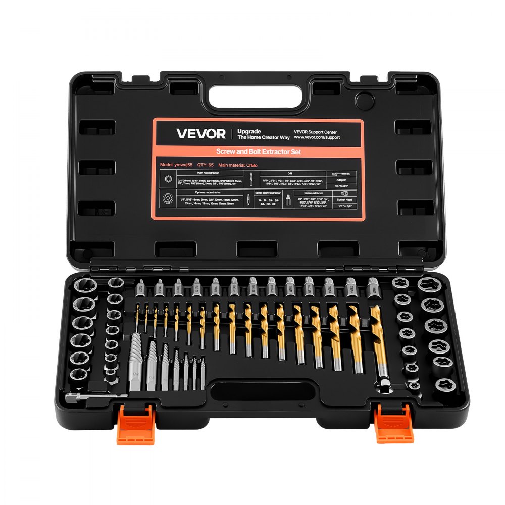 VEVOR 65-delige bout-, moer- en schroefverwijderset met boortjes, schroefverwijderaars met adapters en stevige opbergkoffer (zwart), schroefverwijderaars van chroom-molybdeenstaal voor het verwijderen van bouten, moeren en schroeven.