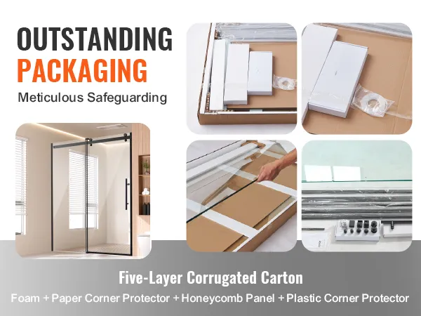 The outer package of the semi-frameless shower sliding door is selected from a five-layer corrugated carton, lined with foam, paper corner protectors, honeycomb panels, and plastic corner protectors to maximize its integrity from factory to installation.