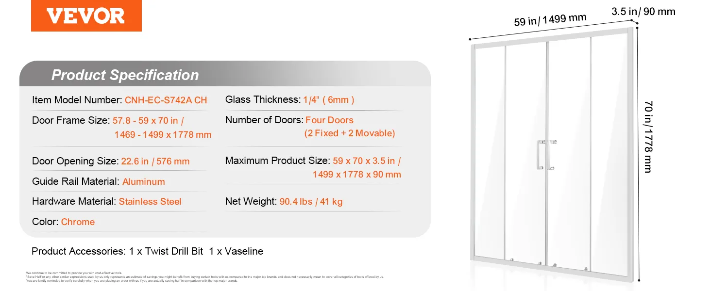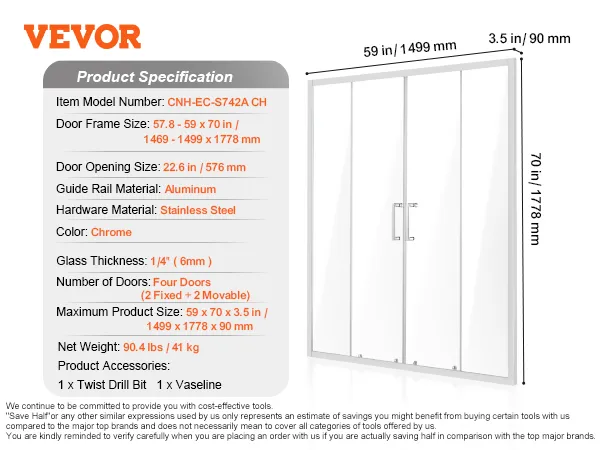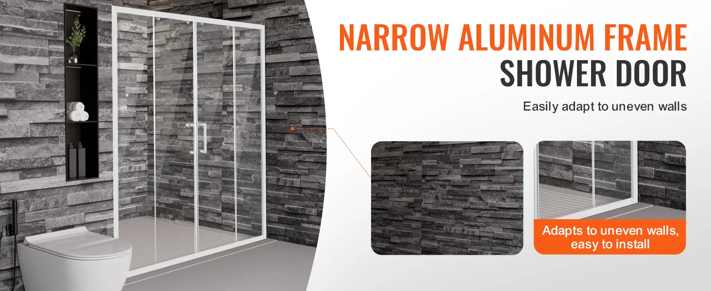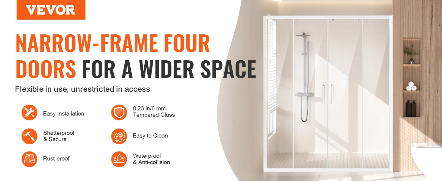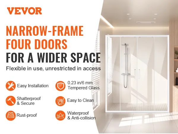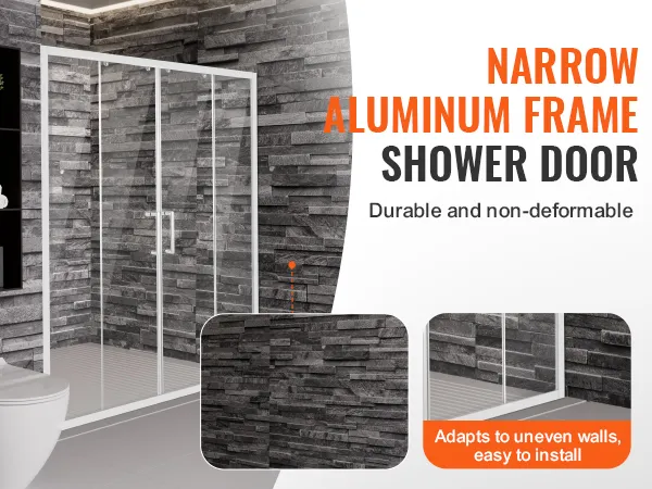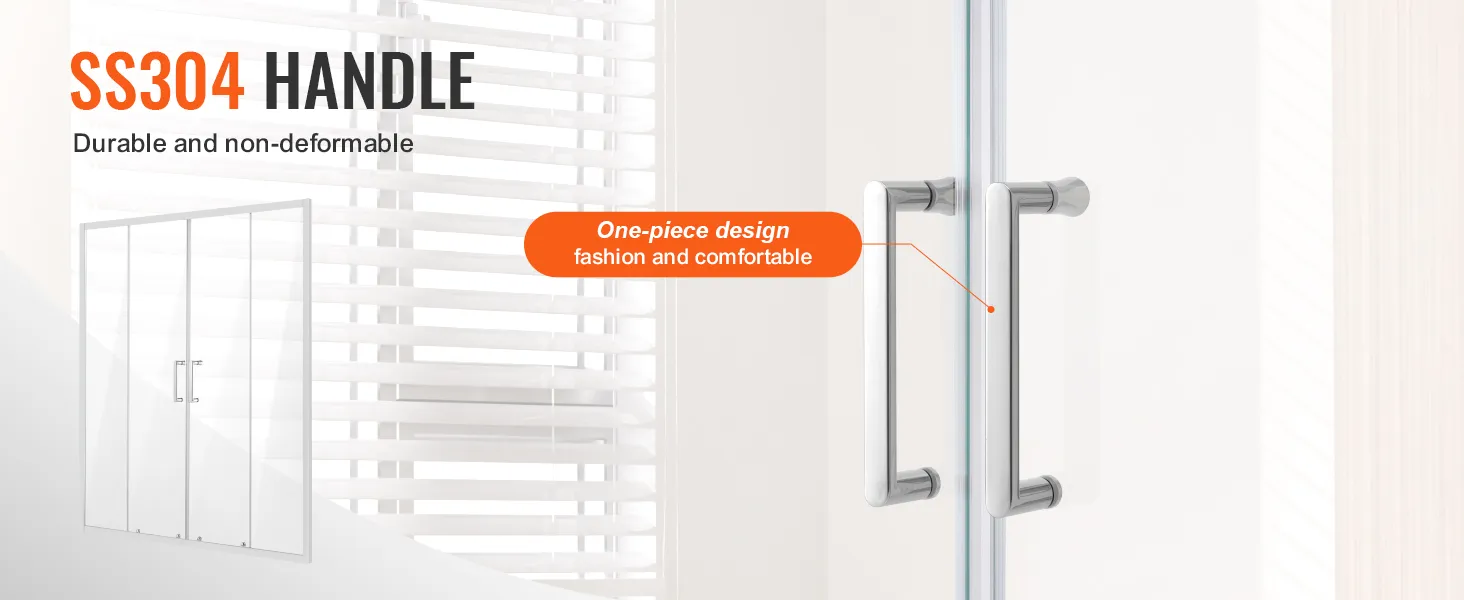 Stabiel en veilig: de dubbele schuifdeur is voorzien van 1/4 inch (6 mm) verdikt SGCC onbreekbaar gehard glas, dat de hardheid en slagvastheid opmerkelijk verhoogt. Het zorgt ervoor dat er geen spatten ontstaan, zelfs als het kapot is, en vormt zo een solide verdediging voor uw badkamerruimte.