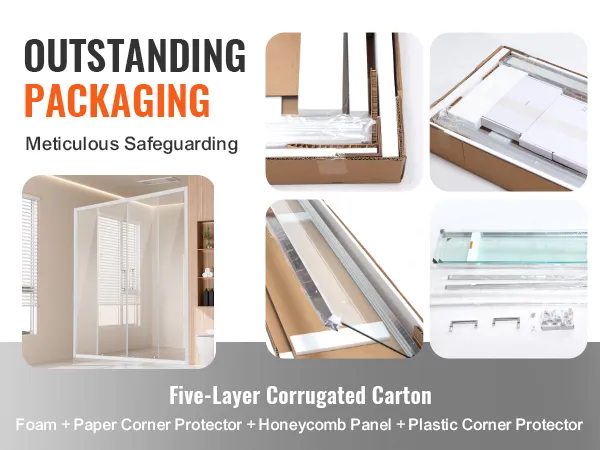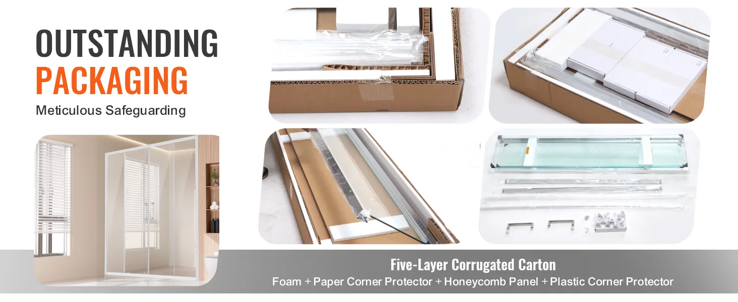 De buitenverpakking van de semi-frameloze doucheschuifdeur is gemaakt van vijflaags golfkarton bekleed met schuim, papieren hoeken, honingraatpanelen en plastic hoeken om de integriteit van fabriek tot installatie te maximaliseren.