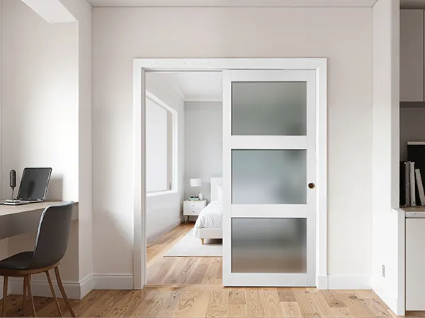 Dankzij een stevig houten frame, een waterbestendige afwerking en drie panelen van gehard matglas glijden onze schuifdeurkasten soepel en besparen ze ruimte. Elk deurpaneel is 940 mm (B) x 1986 mm (H) en 22 mm dik. Ze passen in deuropeningen van 1829 x 2032 mm.