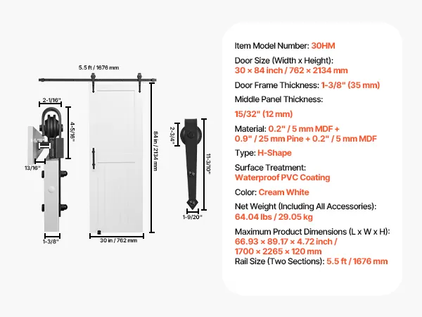 VEVOR Schuifdeursysteem (762 x 2134 mm) Gemaakt van zeer sterke MDF-platen, schuurdeur met bevestigingsset en waterdicht PVC-oppervlak en H-frame voor woonkamer badkamer wit