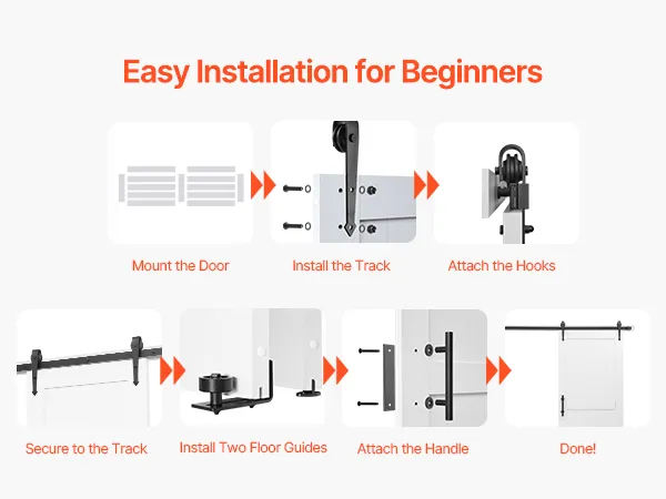 Eenvoudige installatie voor beginners: onze barndeurset bevat alle bevestigingsmaterialen en gereedschappen, evenals duidelijke, genummerde instructies. De installatie is eenvoudig en de deur kan zowel links- als rechtsdraaiend worden gemonteerd.