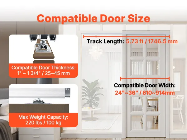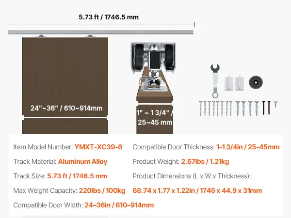 Deze schuifdeurbeslagset heeft een lengte van 1746 mm en is geschikt voor deurdiktes van 25 tot 45 mm en deurbreedtes van 610 tot 914 mm. Het maximale draagvermogen is 100 kg. U kunt de maat kiezen die bij uw behoeften past.