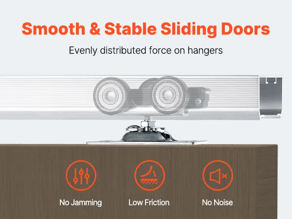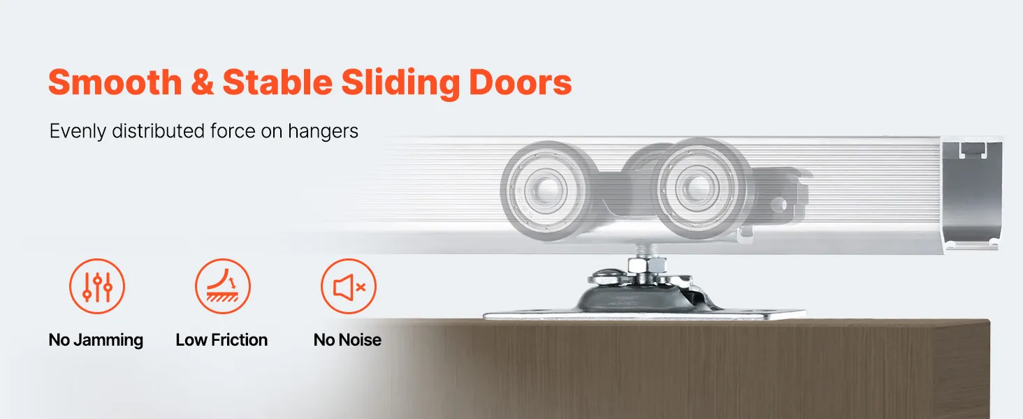 De hangers in deze schuifdeurset hebben een driewielerontwerp met robuuste kogellagerkernen die zorgen voor een gelijkmatige gewichtsverdeling. Hierdoor glijdt de deur soepel, is er minder geluid en is een stabiele werking gegarandeerd.