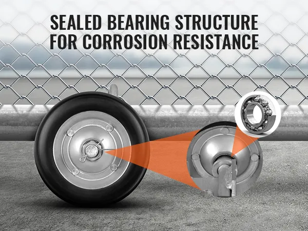 De zwenk- en zwenkwielen zijn voorzien van afgedichte lagers en bieden corrosiebestendigheid en bescherming tegen water en stof. Dit zorgt voor soepel glijden en vermindert wrijving en geluid bij dagelijks gebruik.
