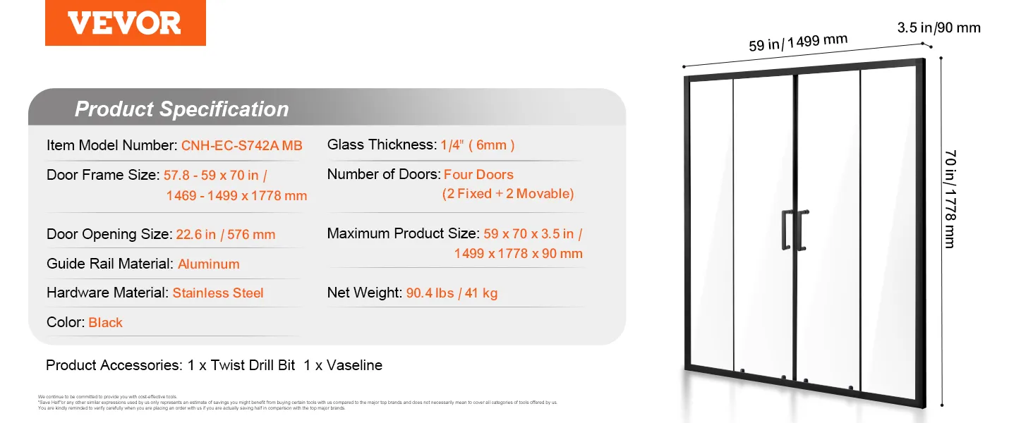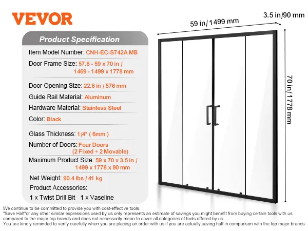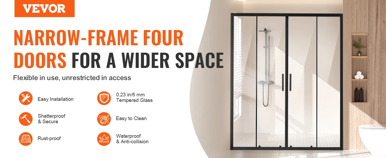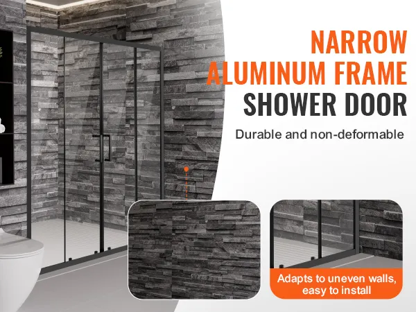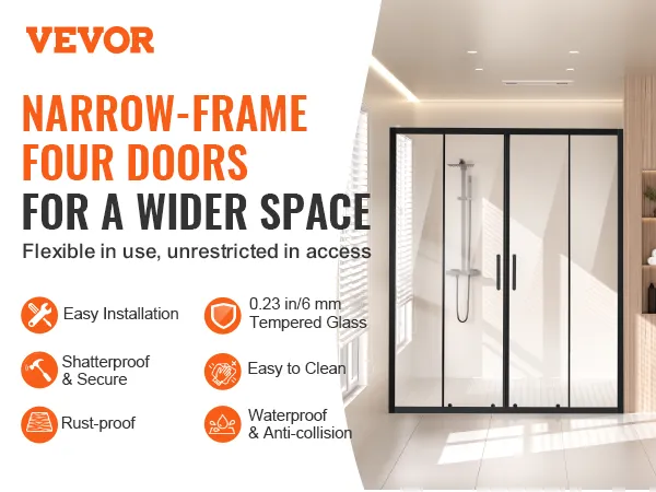 Stabiel en veilig: de dubbele schuifdeur is voorzien van 1/4 inch (6 mm) verdikt SGCC onbreekbaar gehard glas, dat de hardheid en slagvastheid opmerkelijk verhoogt. Het zorgt ervoor dat er geen spatten ontstaan, zelfs als het kapot is, en vormt zo een solide verdediging voor uw badkamerruimte.