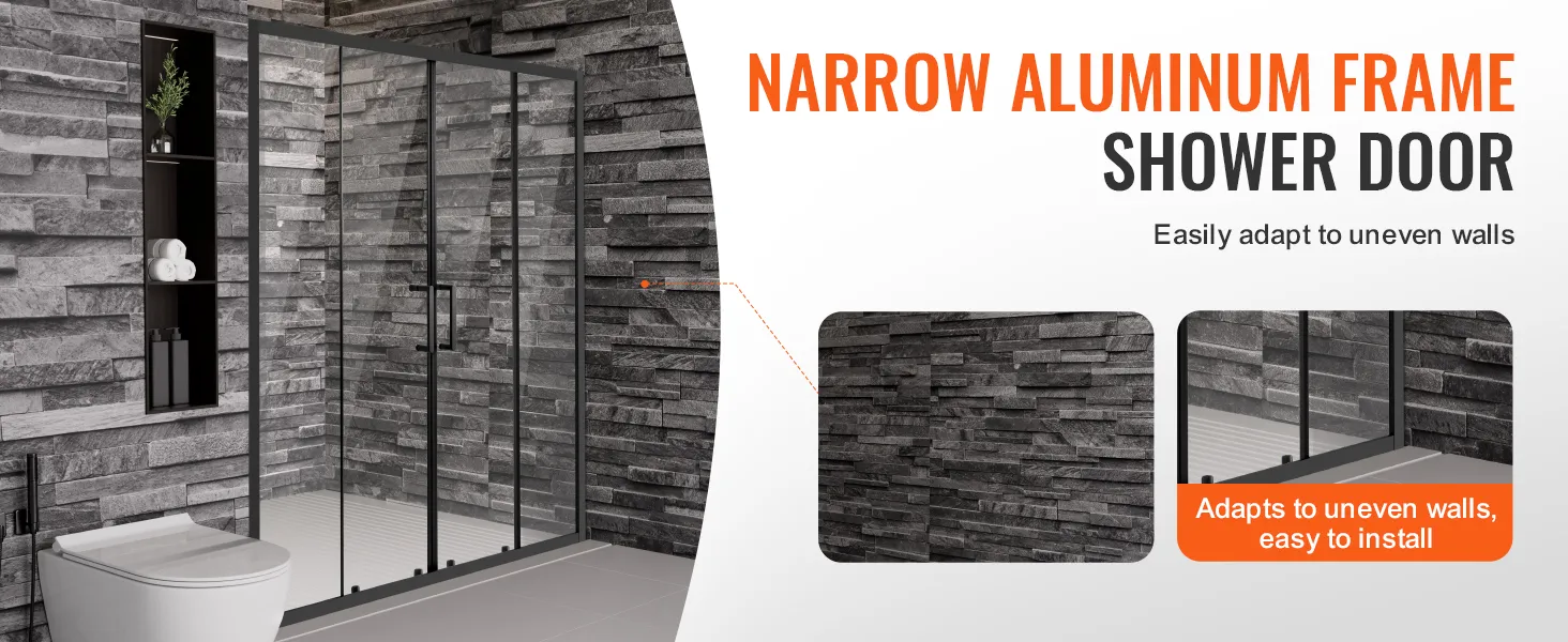 Deze semi-frameloze dubbele schuifdeur is gemaakt van 6 mm onbreekbaar gehard glas voor corrosiebestendigheid en duurzaamheid. Het smalle aluminium frame zorgt voor een breder zicht.