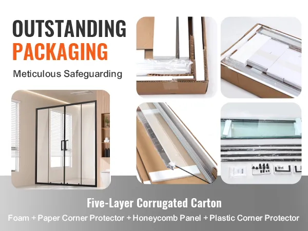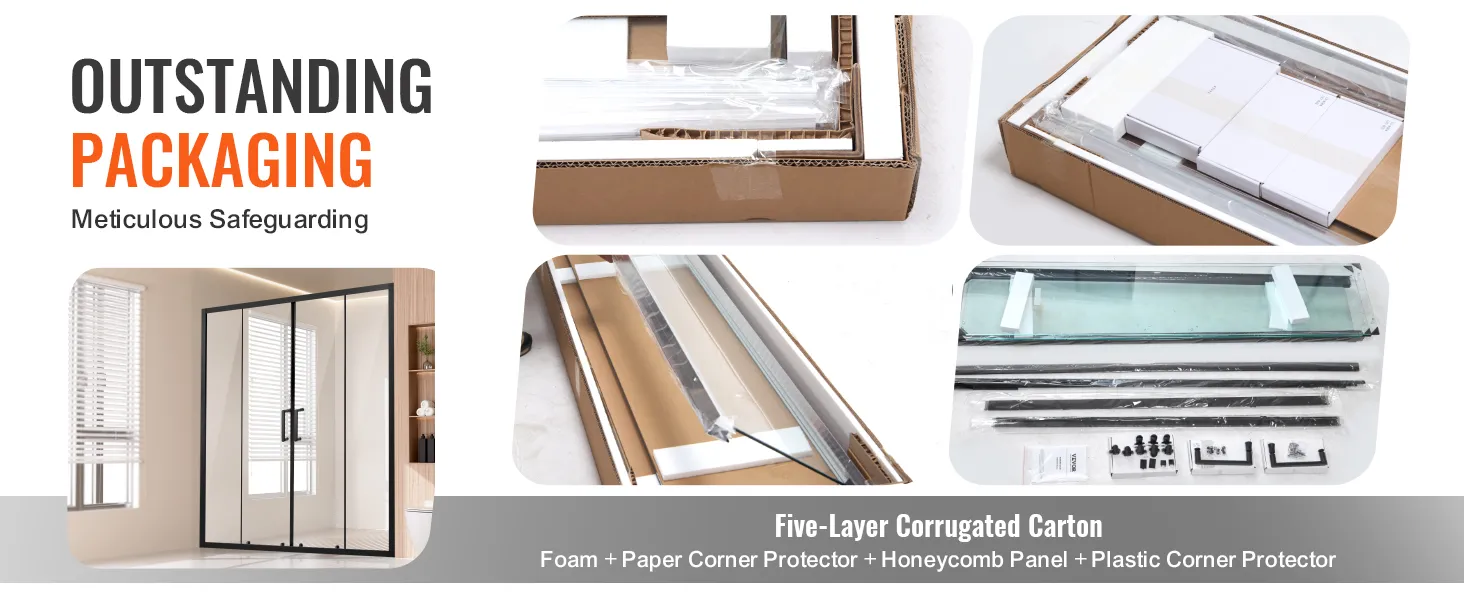De buitenverpakking van de semi-frameloze douchedeur is gemaakt van vijflaags golfkarton bekleed met schuim, papieren hoeken, honingraatpanelen en plastic hoeken om de integriteit van fabriek tot installatie te maximaliseren.