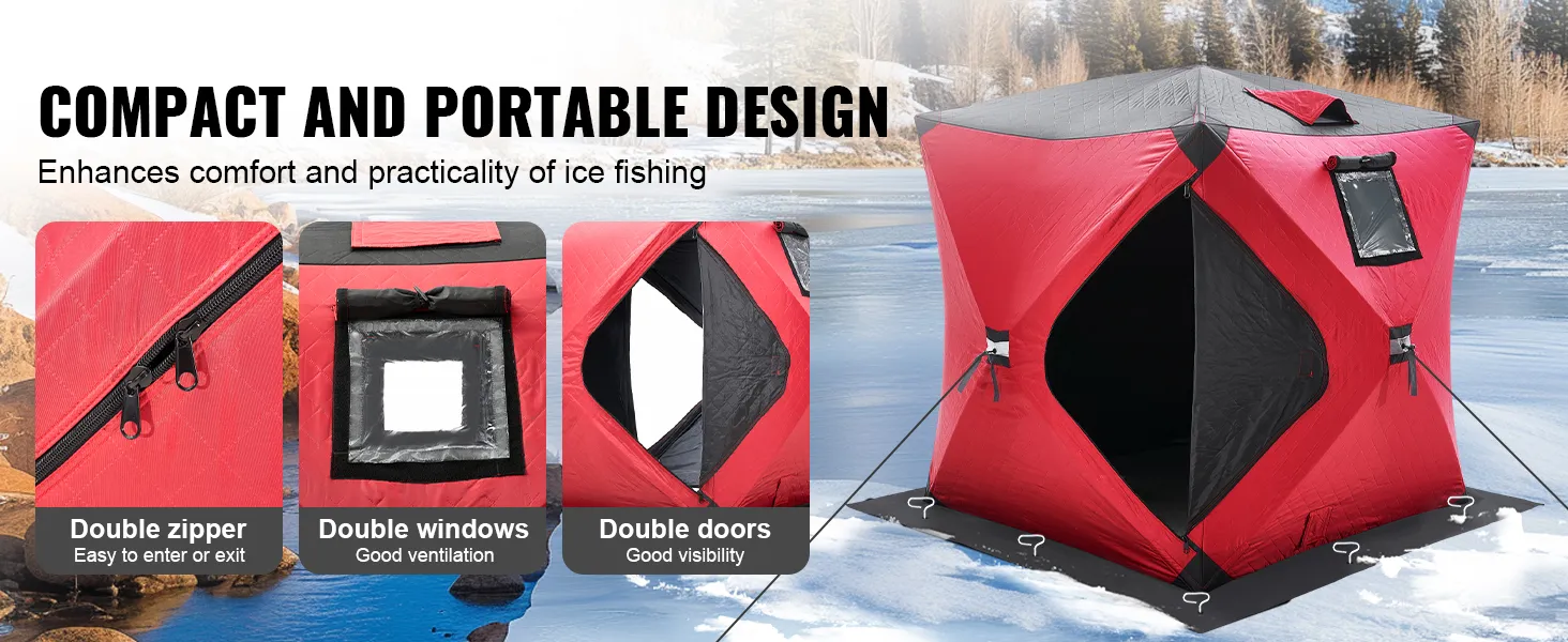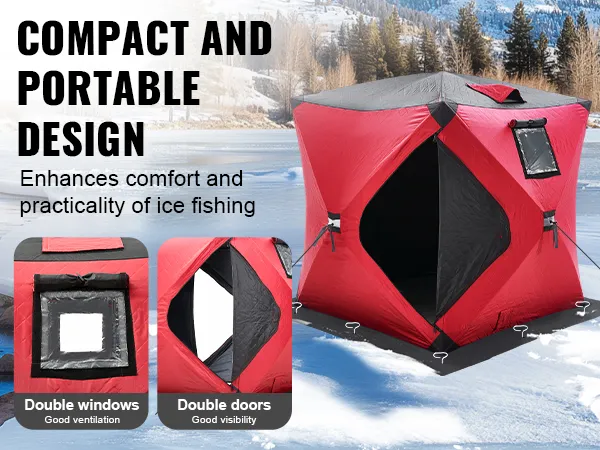 This portable ice shelter features a double-door and double-window design, offering excellent ventilation and lighting. The double zipper design allows for quick and easy entry or exit, providing comfort and convenience while fishing outdoors.