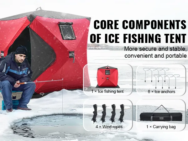 This ice shanty for winter fishing includes a tent, ice anchors, wind ropes, and a portable carrying bag. The tent’s design is stable, with ice anchors ensuring stability. Enjoy fishing or outdoor adventures, staying protected from cold and snow while having fun.
