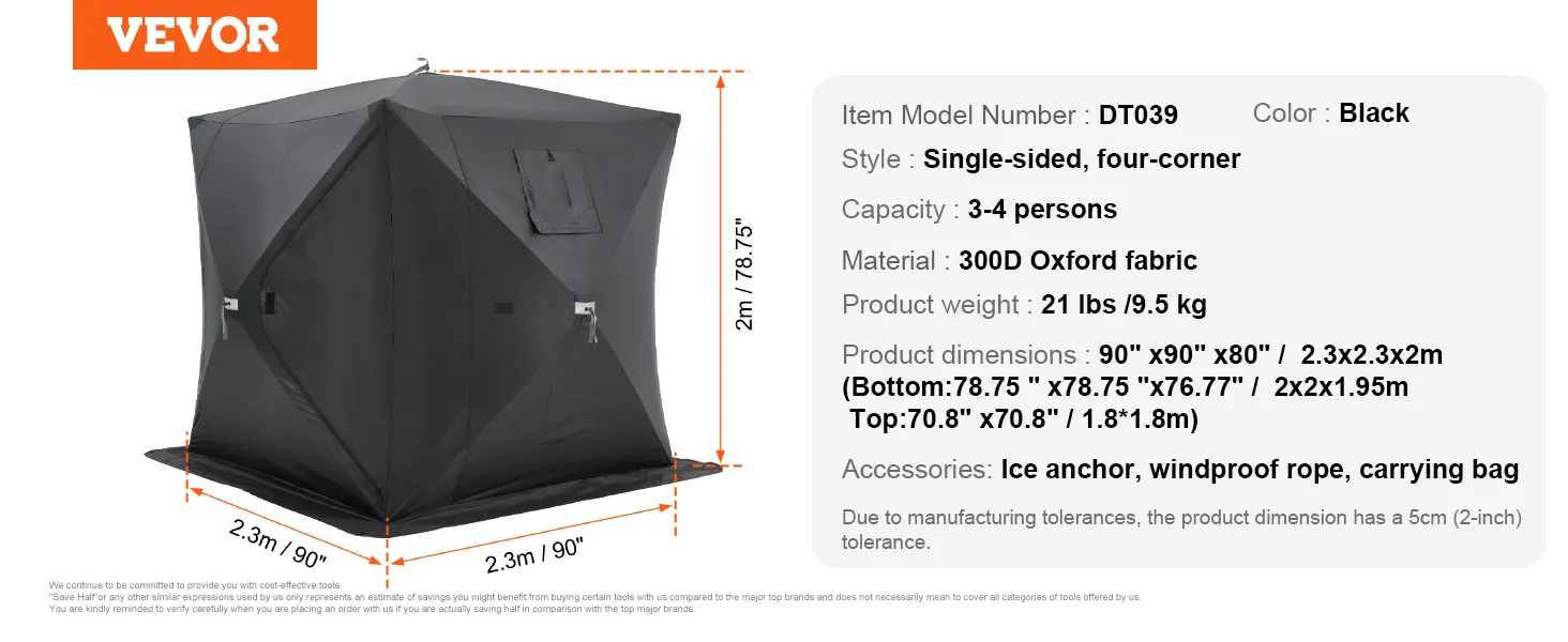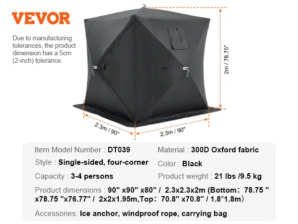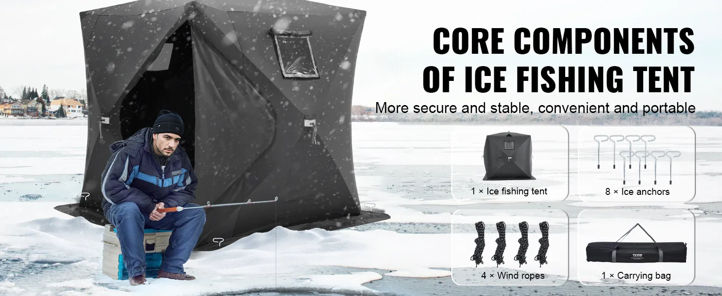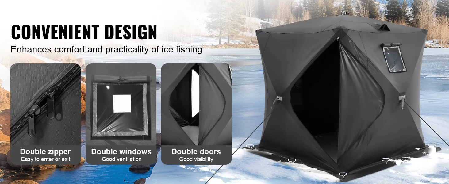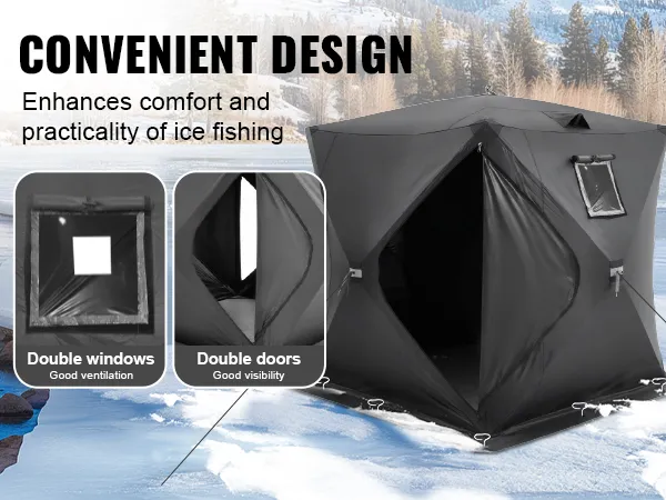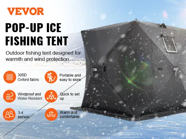 Deze ijsvistent is gemaakt van 300D Oxford-stof en biedt uitzonderlijke windbescherming die zelfs bij sneeuw en wind stabiel blijft. Het ruime interieur biedt ruimte voor 3-4 personen.
