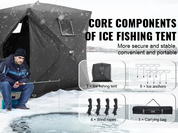 Deze wintervis-ijshut bevat een tent, ijsankers, windtouwen en een draagbare draagtas. Het tentontwerp is stabiel en ijsankers zorgen voor stabiliteit.