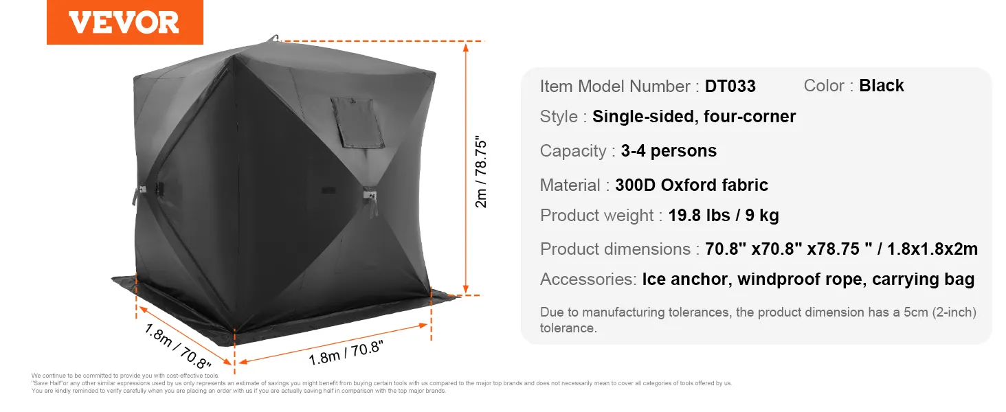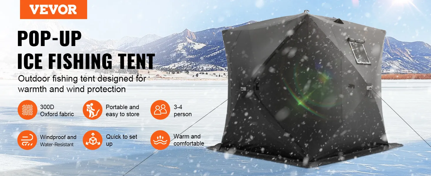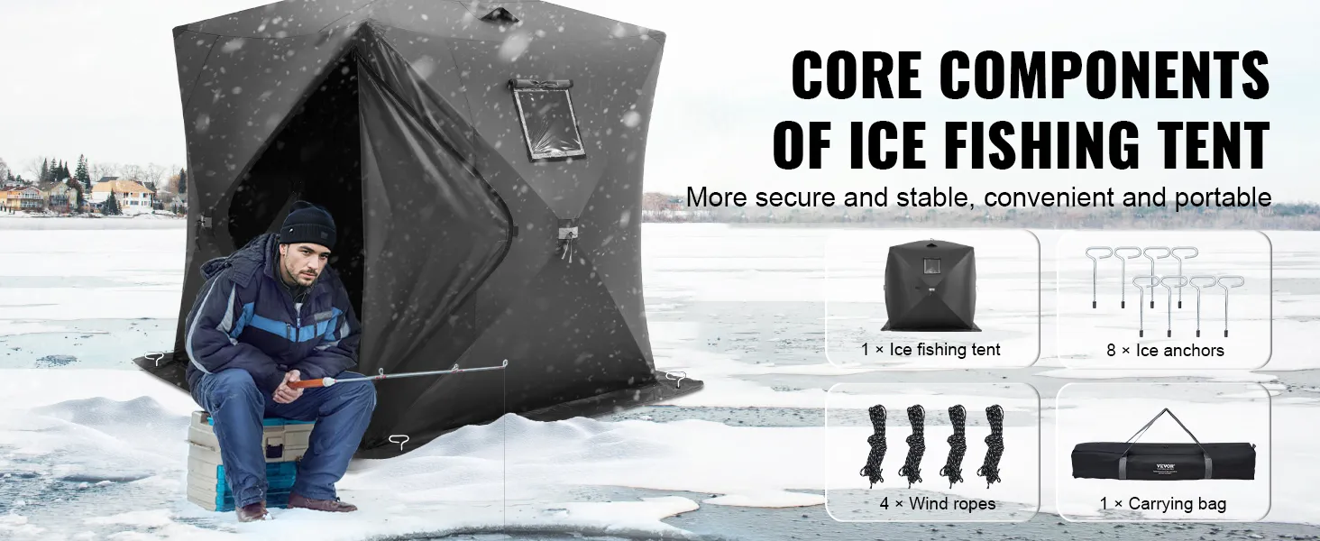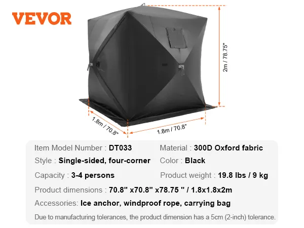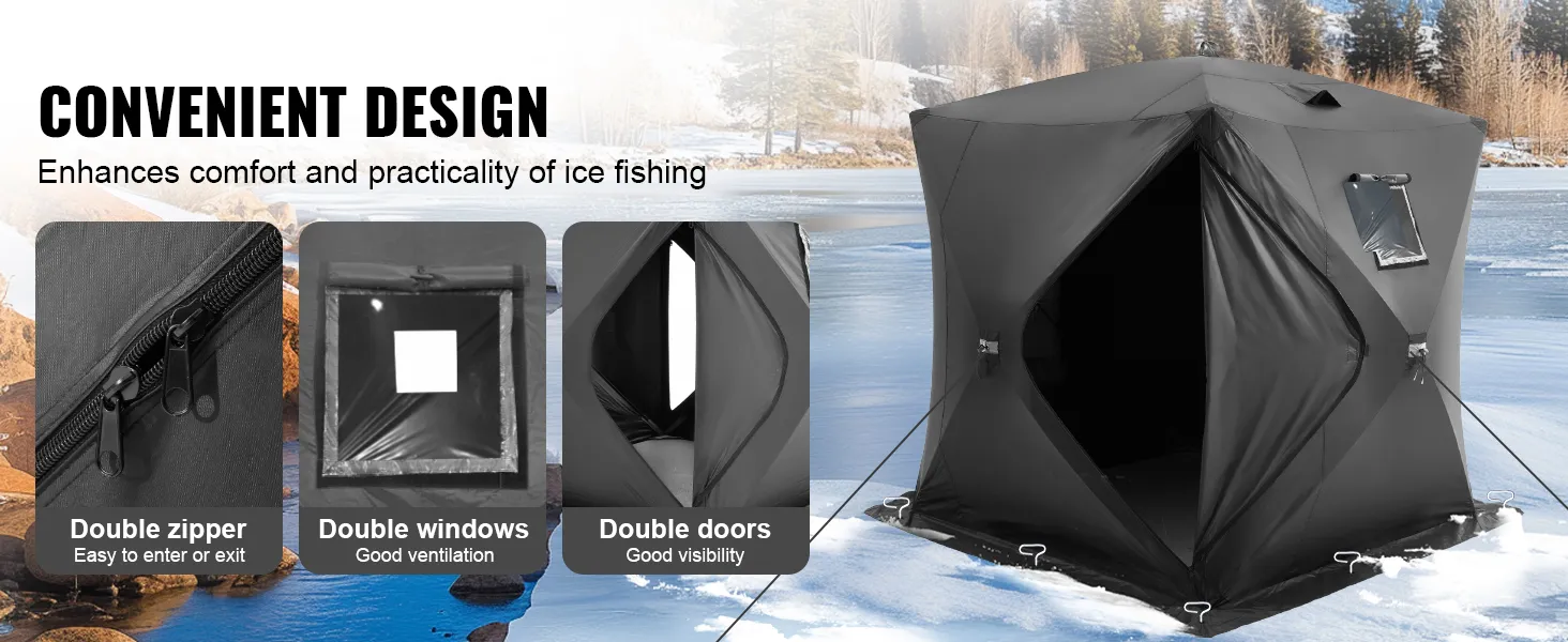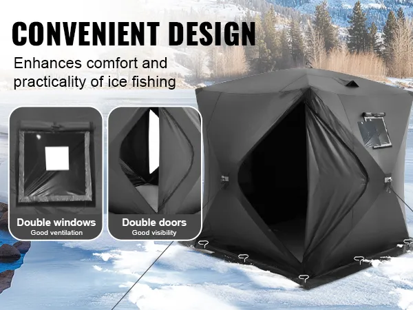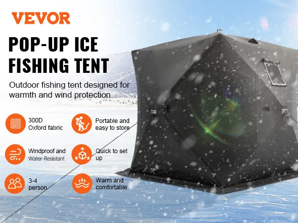 Deze ijsvistent is gemaakt van 300D Oxford-stof en biedt uitzonderlijke windbescherming die zelfs bij sneeuw en wind stabiel blijft. Het ruime interieur biedt ruimte voor 3-4 personen.
