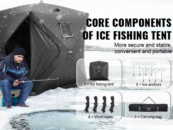 Deze wintervis-ijshut bevat een tent, ijsankers, windtouwen en een draagbare draagtas. Het tentontwerp is stabiel en ijsankers zorgen voor stabiliteit.