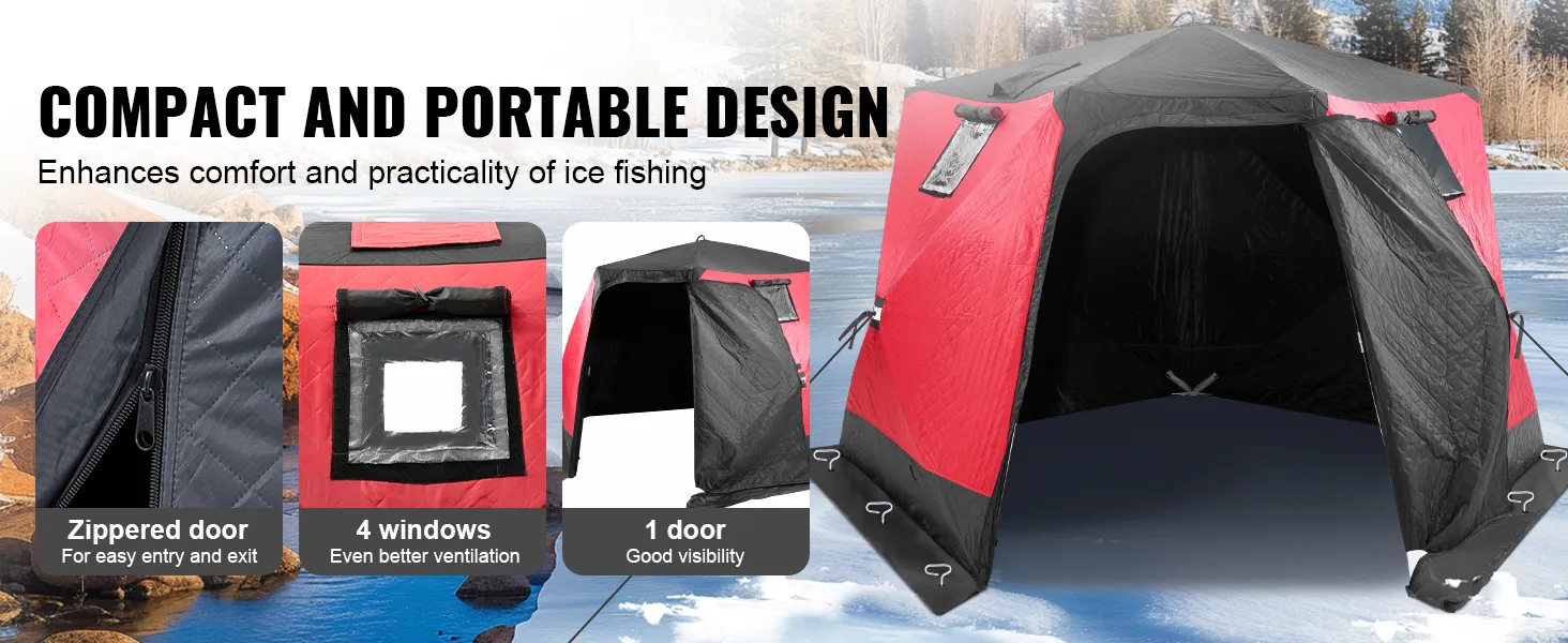 The portable ice shelter is equipped with a double zipper design, allowing for easy entry and exit. The four-window design offers superior ventilation, ensuring fresh air while ice fishing. The single large door provides a wide field of view, enhancing your ice fishing experience.