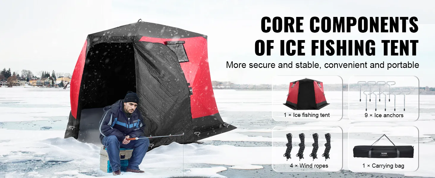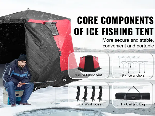 This ice shanty for winter fishing includes a tent, ice anchors, wind ropes, and a portable carrying bag. The tent’s design is stable, with ice anchors ensuring stability. Enjoy fishing or outdoor adventures, staying protected from cold and snow while having fun.