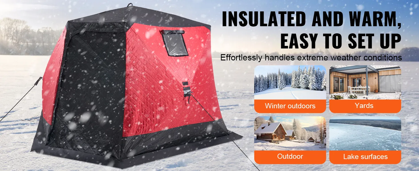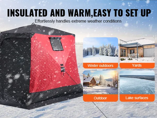 This ice shelter fishing tent is specially designed for outdoor ice fishing enthusiasts, suitable for various scenes such as winter outdoors, backyards, outdoor areas, and lakes. It can be quickly set up, allowing you to enjoy a warm, cozy space in no time.