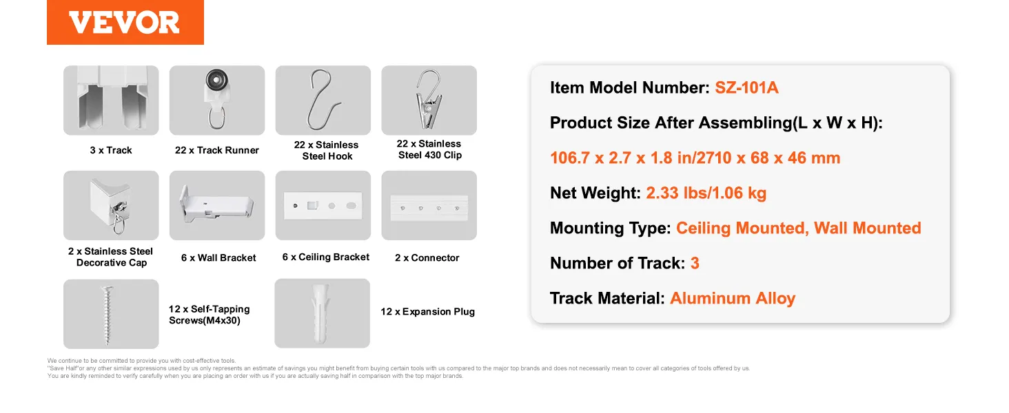 Verstelbare lengte: elke gordijnrail is 900 mm lang. Deze set bevat 3 rails met een totale lengte van 2,7 m (106,7 inch) indien aangesloten. Je kunt ze ook met een kniptang op de gewenste lengte inkorten.