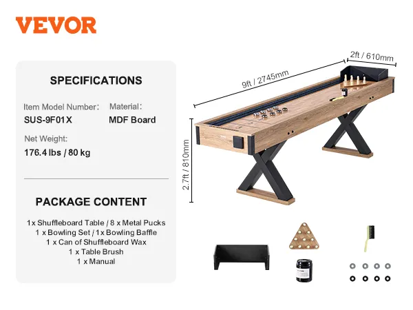 This shuffleboard table set includes a high-quality shuffleboard table, 8 metal pucks, the bowling set and baffle, a can of shuffleboard wax, and a table brush. Maintain optimal performance and ensure your pucks glide effortlessly.