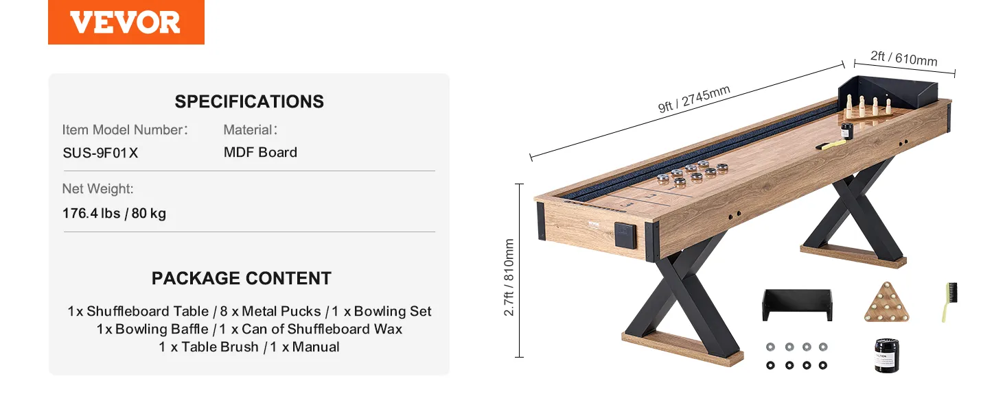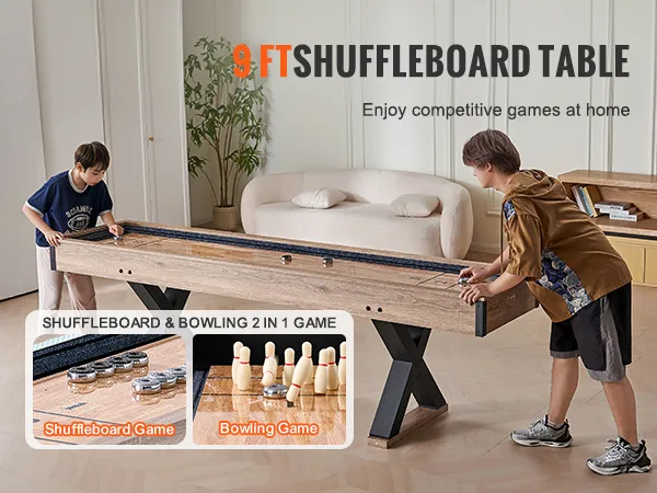 VEVOR Shuffleboard Table, 9 ft Shuffleboard for Family Game Rooms, 2 in 1 Shuffleboard and Bowling Combo Game Set, with Scratch-Resistant Playfield, Legs, 8 Pucks, Bowling Set, Wax, and Table Brush