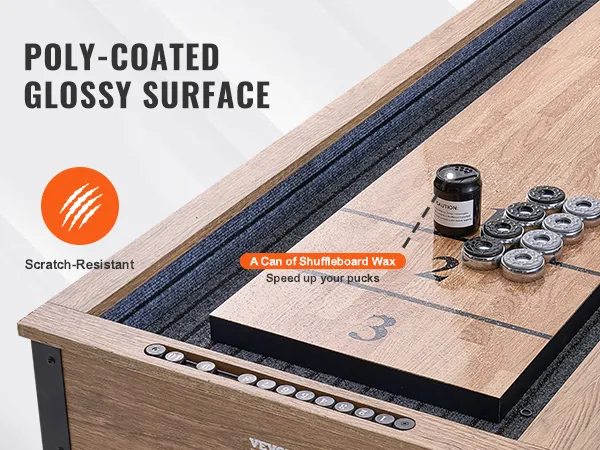 Featuring a poly-coated surface, our shuffleboard table ensures smooth and rapid puck movement. The glossy playfield is scratch-resistant, keeping it in excellent condition even after many games.