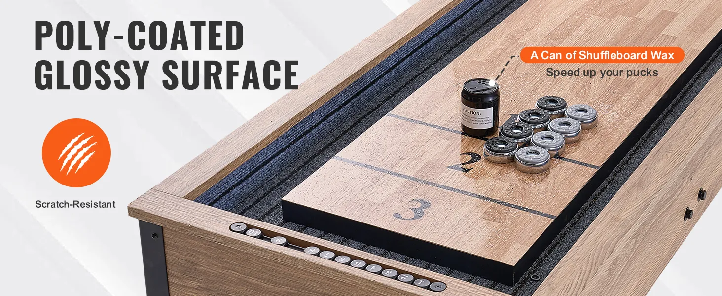 Glossy Playfield: Our shuffleboard table boasts a poly-coated surface, ensuring smooth and fast puck action. The glossy playfield is scratch-resistant, maintaining its pristine look even after numerous games.