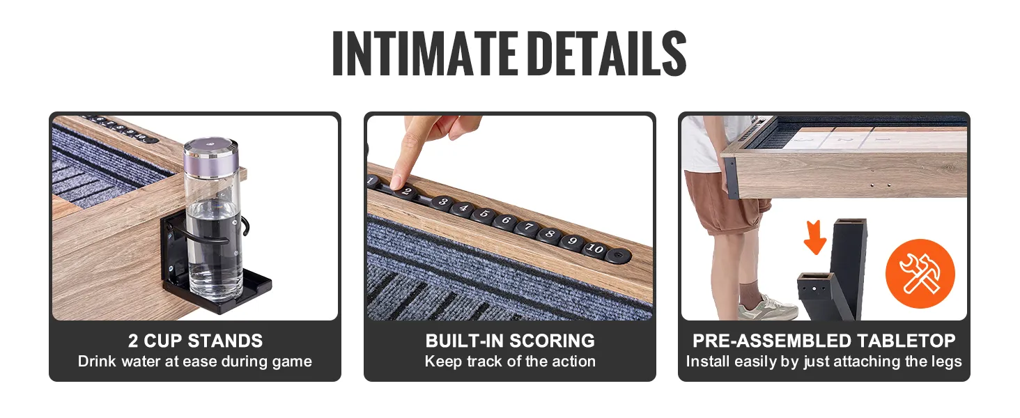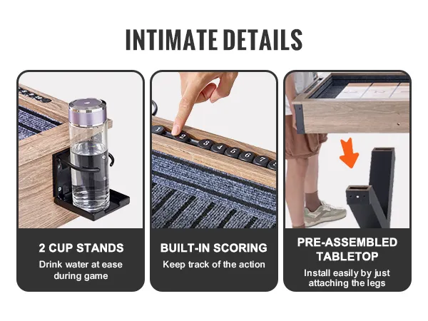 Thoughtful Details: The shuffle board comes with 2 cup stands, allowing you to keep your drinks within reach. Built-in scoring keeps track of the action, so you can stay focused on your game. The pre-assembled tabletop means you only need to attach the legs, making setup quick and easy.