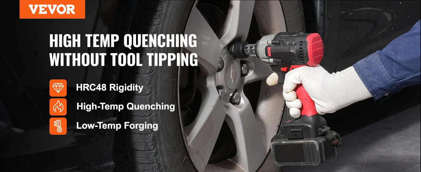 Industriële kwaliteit Cr-Mo gelegeerd staal: Onze 3/8" (9,5 mm) industriële kwaliteit Cr-Mo gelegeerd staal slagschroevendraaierset is vervaardigd uit hoogwaardig slagvast gelegeerd staal en biedt uitzonderlijke verbeteringen op het gebied van slagvastheid en schokabsorptie. Vacuüm warmtebehandeling verwarmt en koelt het staal snel af, waardoor een gepolijst en extreem duurzaam oppervlak ontstaat. Dit maakt hem geschikt voor verschillende gebruiksomgevingen.
