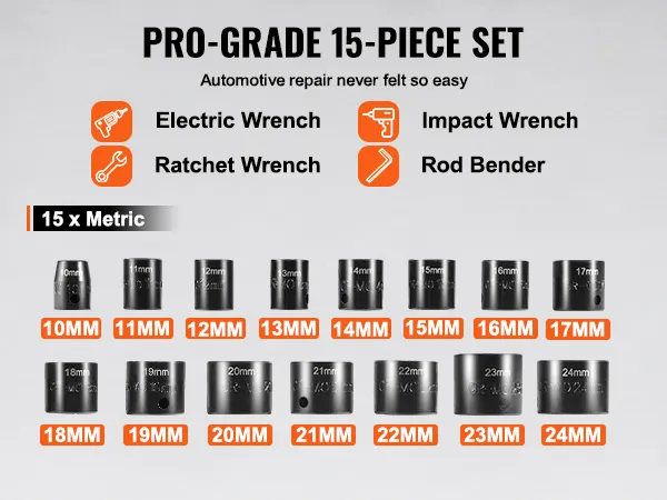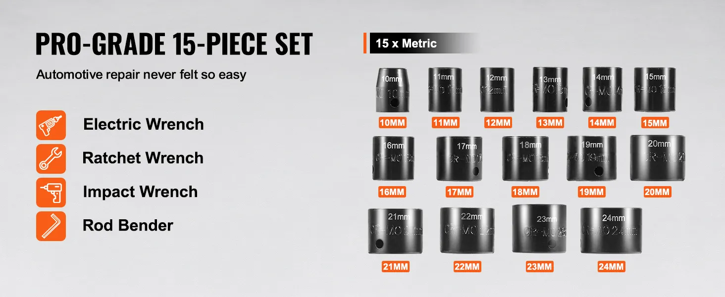 De 15-delige professionele gereedschapsset is geschikt voor elektrische sleutels, slagmoersleutels, ratelsleutels, staafsleutels en ander gereedschap voor auto-onderhoud, montage van apparatuur, industriële productie, prestatietests en meer.
