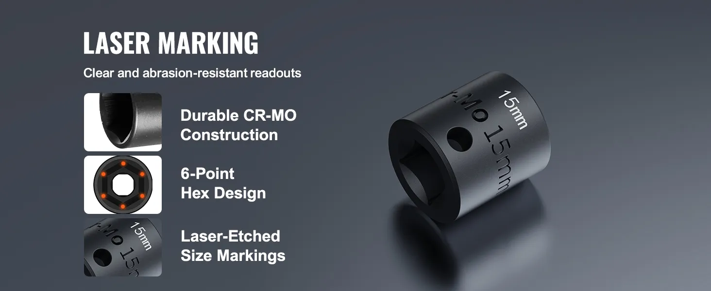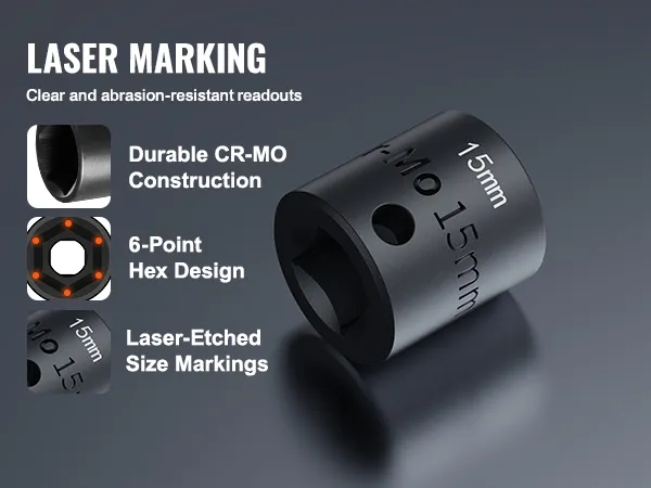 Gemakkelijk leesbare maatmarkeringen: De maatmarkeringen op deze 15-delige slagmoersleuteldoppenset zijn zorgvuldig lasergegraveerd en gerold, waardoor de dopmaten zelfs bij weinig licht gemakkelijk te zien zijn.