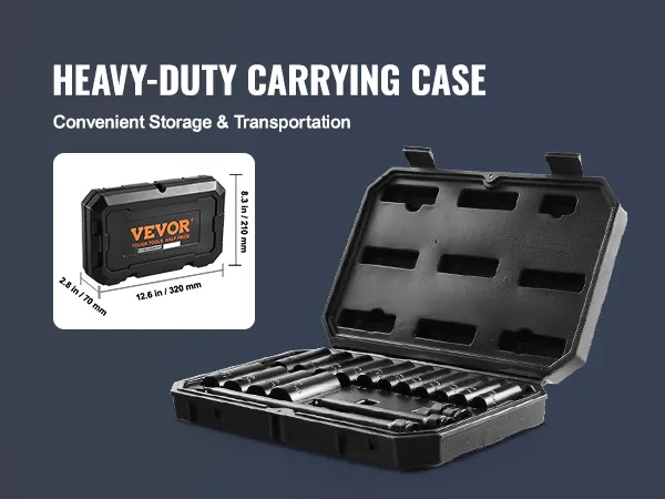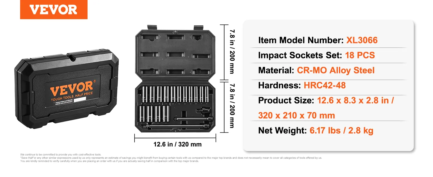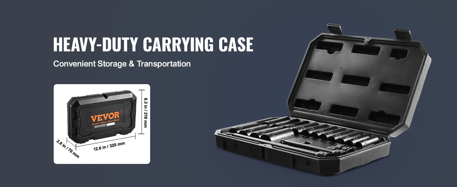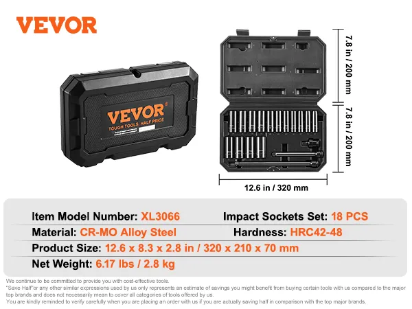 Are you looking for a professional and portable set of impact sockets? VEVOR's 18-piece impact socket set offers a complete range of tools, especially suitable for repairing different brands of automobiles.