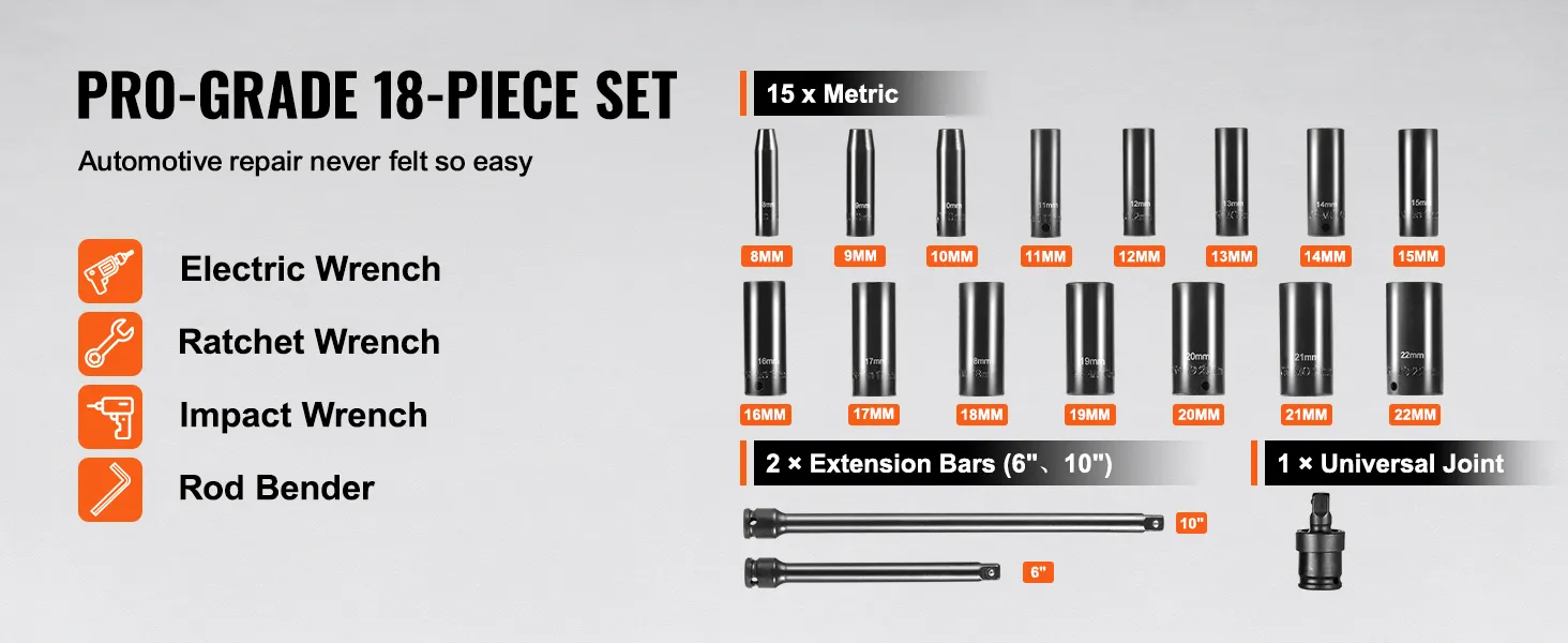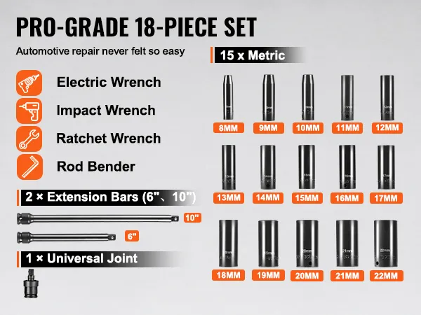 Abundant Components: This comprehensive set includes 15pcs metric deep impact sockets: 8mm, 9mm, 10mm, 11mm, 12mm, 13mm, 14mm, 15mm, 16mm, 17mm, 18mm, 19mm, 20mm, 21mm, 22mm. It also includes 2 extension bars (6", 10") and a universal joint.