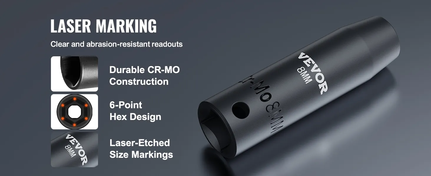 Using laser etching and rolling processes, the extra-large size markings on the sockets are clear and easy to identify even under various lighting conditions. The markings are also resistant to wear.