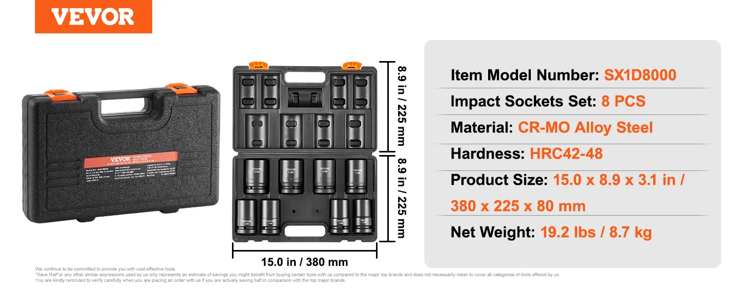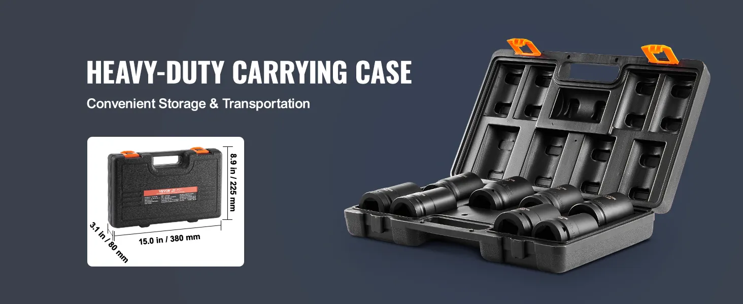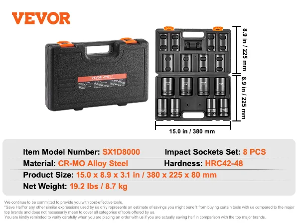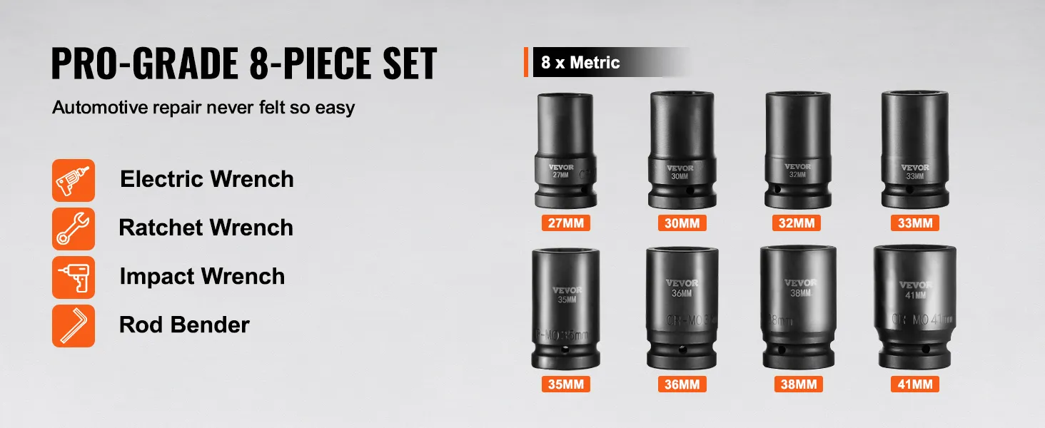 Are you looking for a professional and portable set of impact sockets? VEVOR's 8-piece impact socket set offers a complete range of tools, especially suitable for repairing different brands of automobiles.