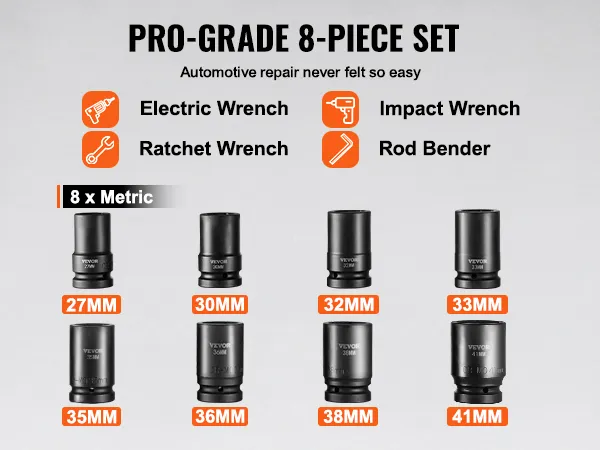 Abundant Components: This comprehensive set includes 8 metric deep impact sockets: 27mm, 30mm, 32mm, 33mm, 35mm, 36mm, 38mm, 41mm, offering a versatile selection for various mechanical tasks.