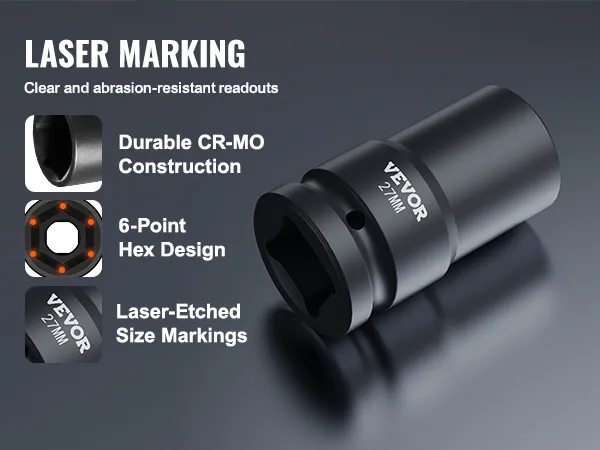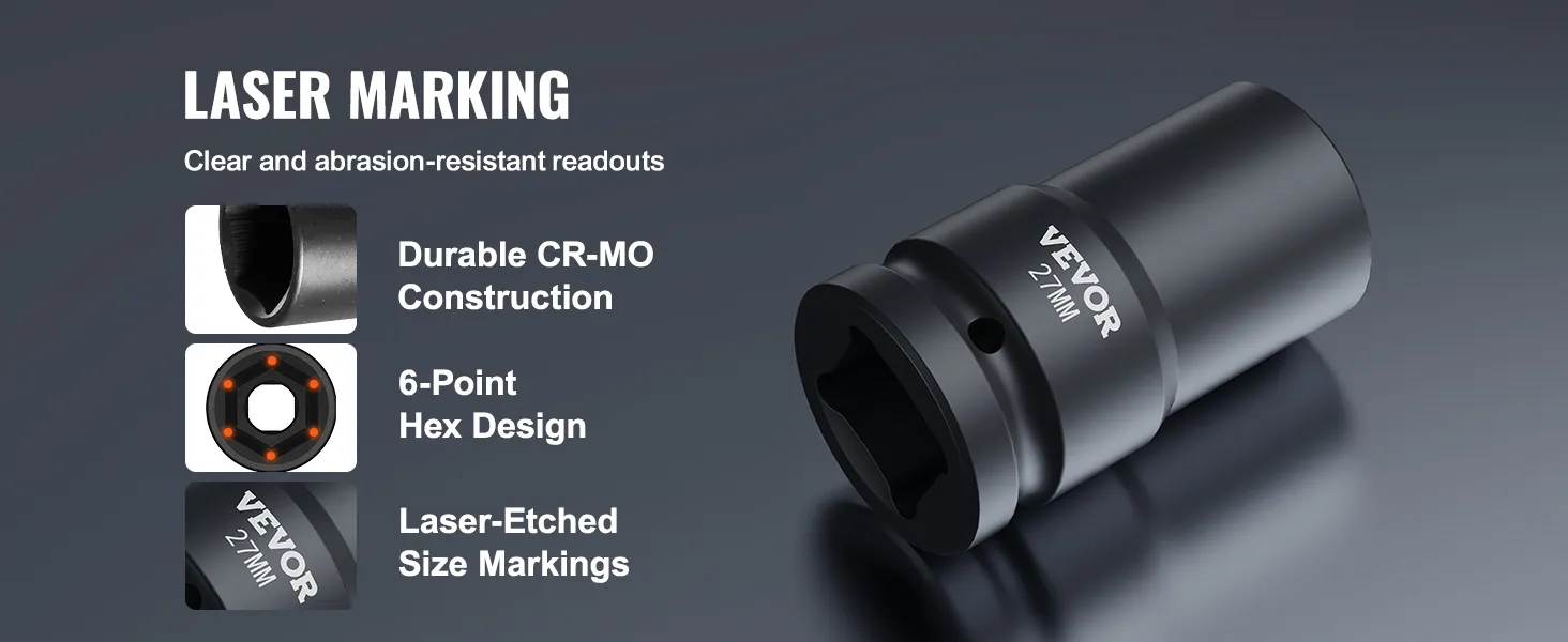 Using laser etching and rolling processes, the extra-large size markings on the sockets are clear and easy to identify even under various lighting conditions. The markings are also resistant to wear.