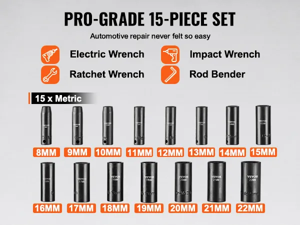De 15-delige professionele gereedschapsset is geschikt voor elektrische sleutels, slagmoersleutels, ratelsleutels, staafsleutels en ander gereedschap voor auto-onderhoud, montage van apparatuur, industriële productie, prestatietests en meer.