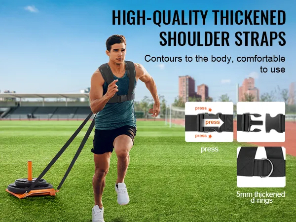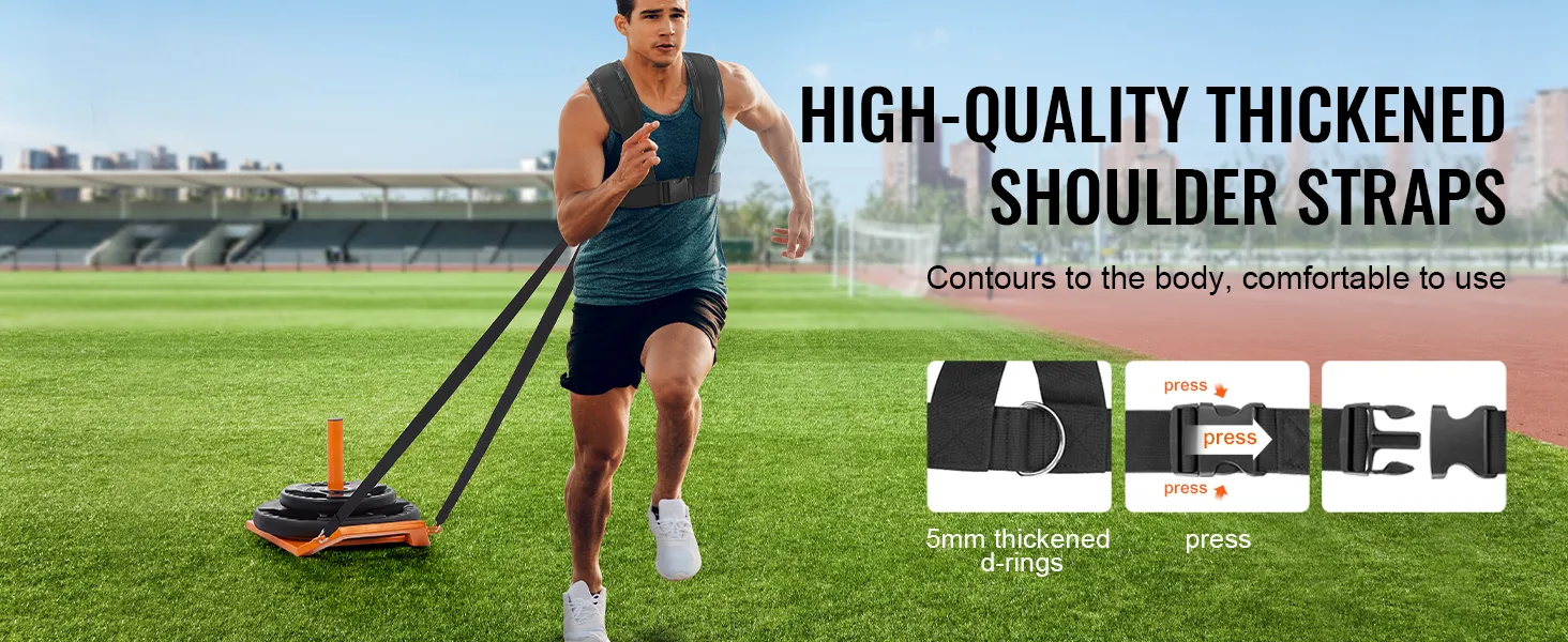 Hoogwaardige schouderbanden: De trekslee voor krachttraining is voorzien van hoogwaardige, verdikte schouderbanden om de belasting van de rug te verminderen. Met 5 mm verdikte D-ringen en verbrede, verdikte schoudergedeelten vergroot het het draagoppervlak en verhoogt het het comfort
