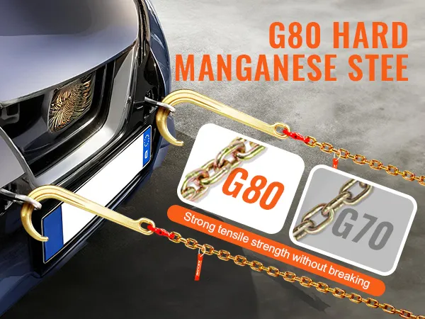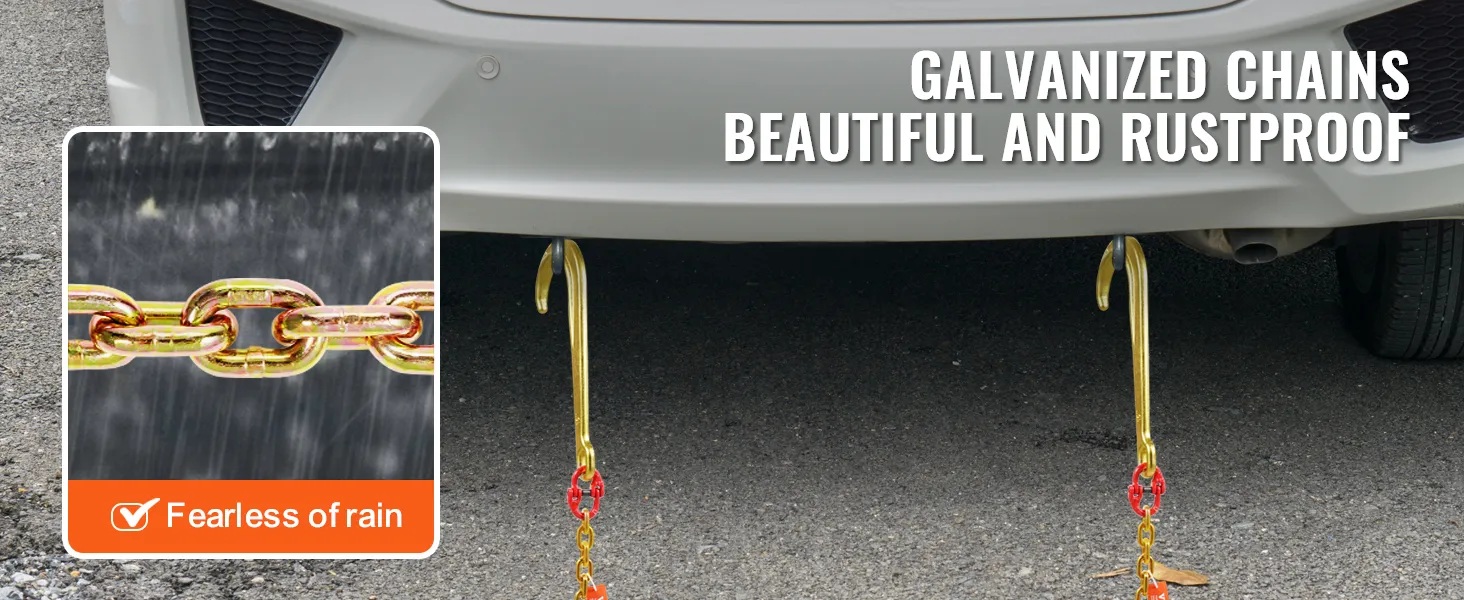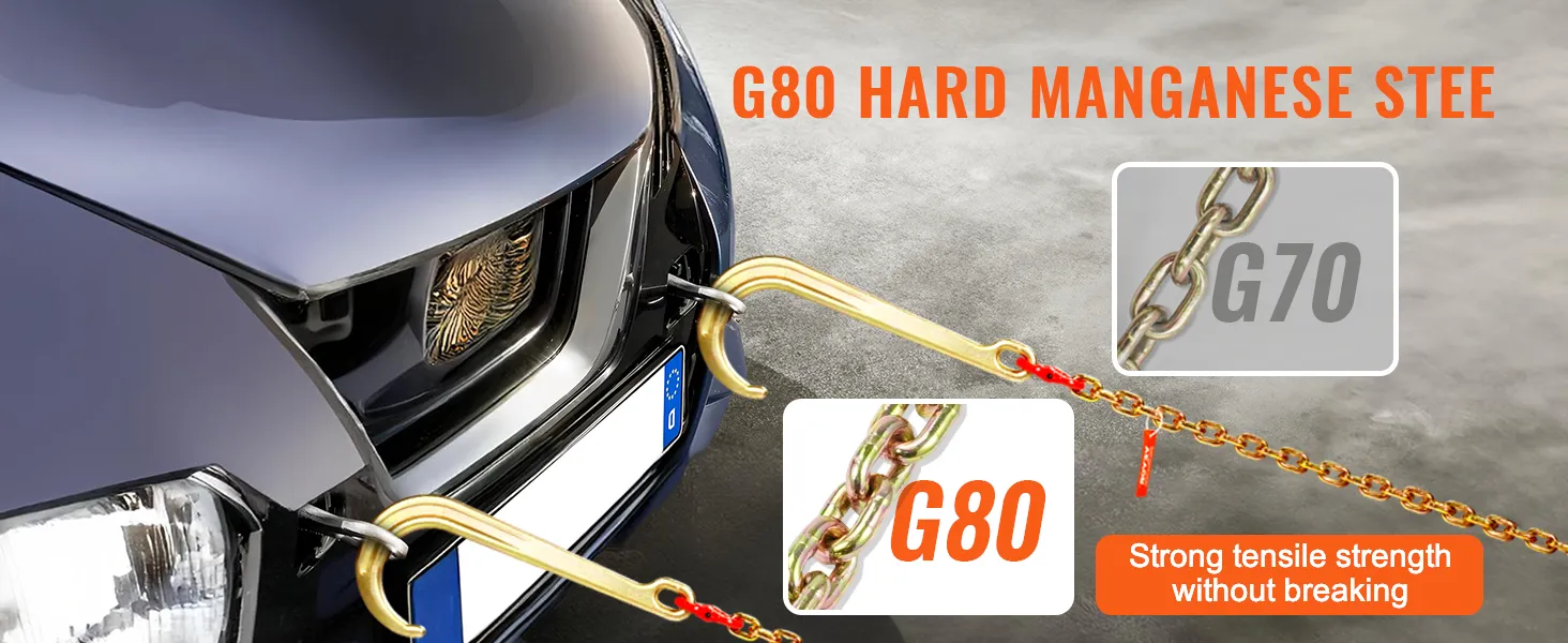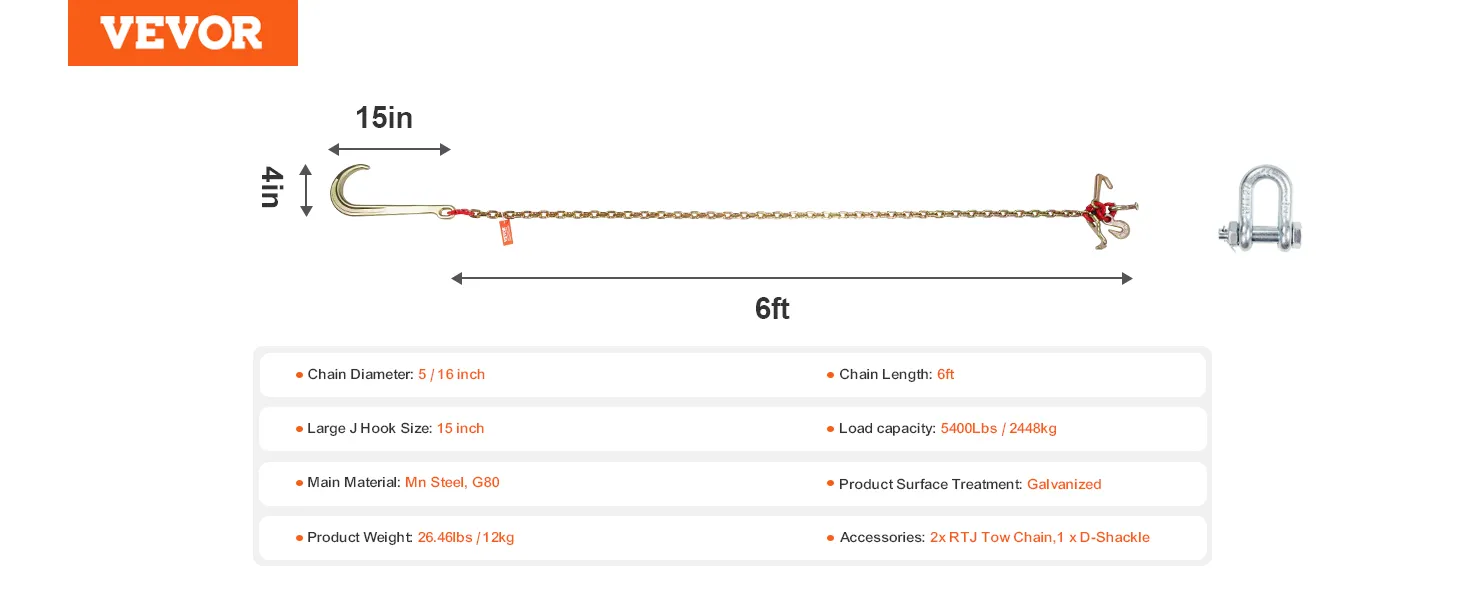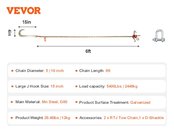 VEVOR, uw exclusieve gereedschapsexpert. Deze J-haakketting is gemaakt van hoogwaardig staal met een algehele sterkte van klasse 80. Ook is hij voorzien van haken die geschikt zijn voor verschillende soorten voertuigen.