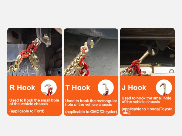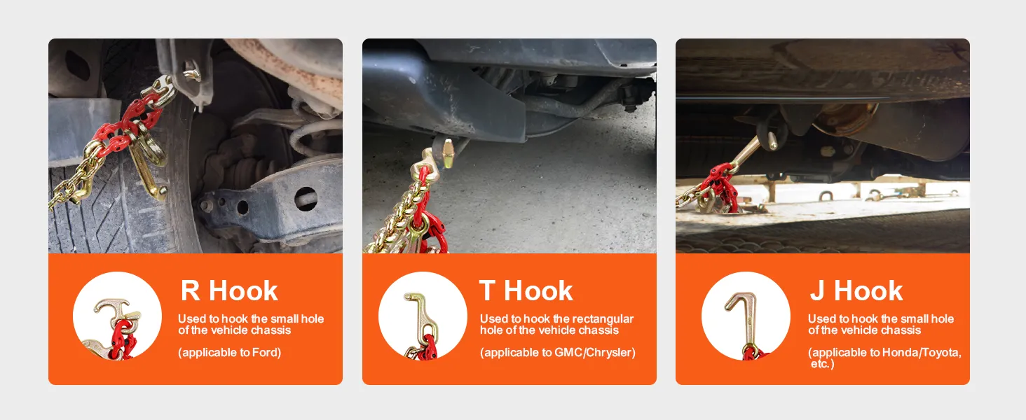 Deze J-haak trekketting bestaat uit een grote J-haak, een R-haak, een T-haak, een kleine J-haak en een grijphaak om de ketting aan verschillende soorten voertuigen te bevestigen.