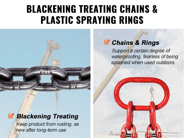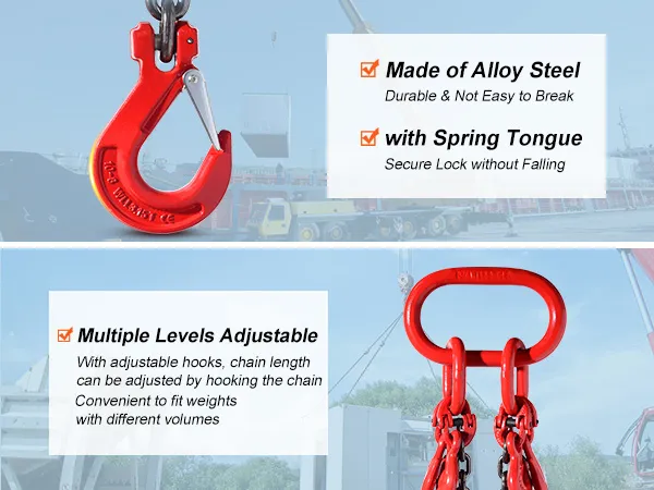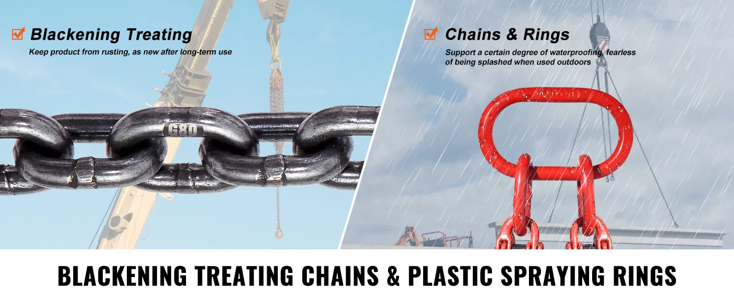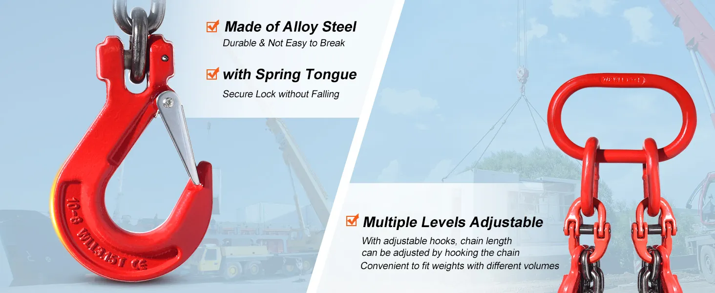 Zware ketting en haak: onze kettingstrop is gemaakt van G80 Mn stalen ketting en gelegeerde stalen haak en is voorzien van volautomatische lastechnologie, ontworpen voor langdurig gebruik.